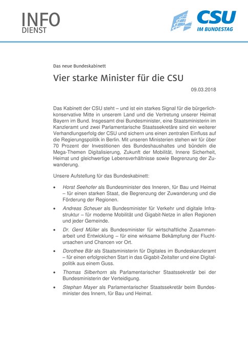 Das Kabinett der CSU steht – und ist ein starkes Signal für die bürgerlich-konservative Mitte in unserem Land und die Vertretung unserer Heimat Bayern im Bund. Insgesamt drei Bundesminister, ...