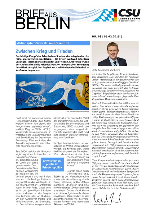 1. Aktionsplan Zivile Krisenprävention: Zwischen Krieg und Frieden 2. Arbeitsprogramm der Europäischen Kommission 2015 3. „Erfolgreiche Wirtschaftspolitik für die Menschen“ 4. Bundestags-ABC: Was ist eine ... Parlamentariergruppe? ...