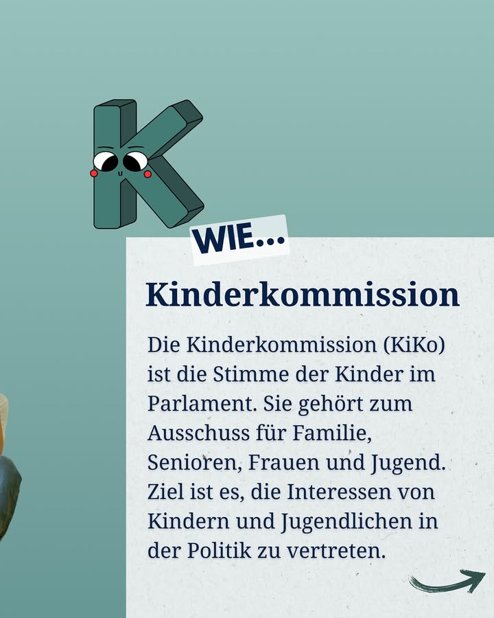 👉 Die Kinderkommission (KiKo) ist sozusagen der „Anwalt der Kinder“ im Parlament. Hier arbeiten Abgeordnete fraktionsübergreifend zusammen, um Kinderrechte zu stärken und Politik kindgerecht zu gestalten.