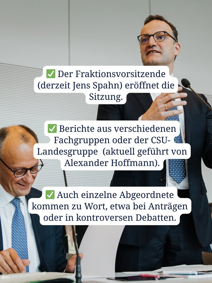 📌Dienstags tagt am Nachmittag die CDU/CSU-Fraktion. Dort werden aktuelle politische Entwicklungen diskutiert, gemeinsame Positionen abgestimmt und das weitere Vorgehen für Plenum und Ausschüsse festgelegt.