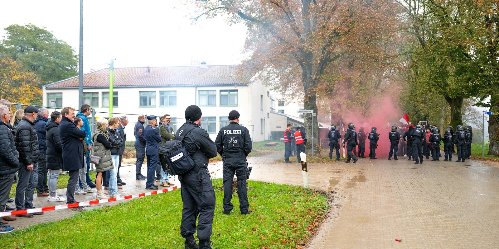 In zwei Gruppen aufgeteilt, wurden die 100 Gäste zunächst über die Arbeitsweise der "BePo" informiert. Im zweiten Teil konnte ein Übungseinsatz der Hundertschaft live beobachtet werden. "Fanmarsch 1. FC Nürnberg" hieß das Szenario, das möglichst realitätsnah inklusive Pyrotechnik, Böllern und Wurfgeschossen nachgestellt wurde.