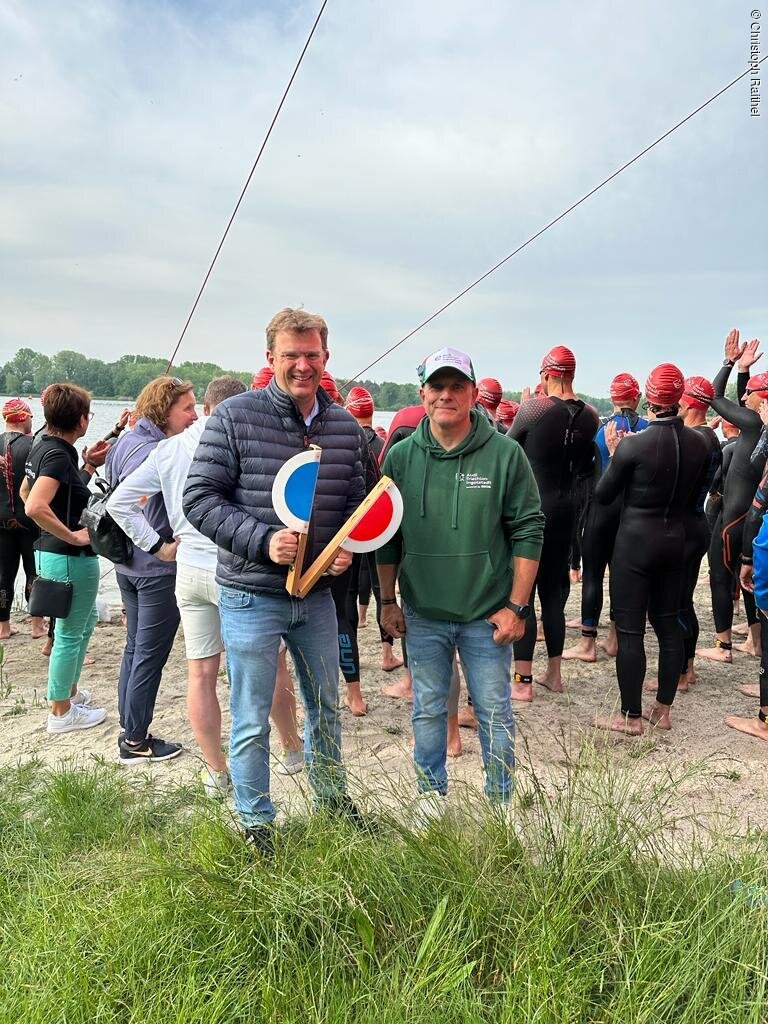 Der Bundestagsabgeordnete Reinhard Brandl gab am Baggersee den Startschuss für den fünften Block der Mitteldistanz und schickte die Schwimmerinnen und Schwimmer auf die 1,9 Kilometer lange Strecke.