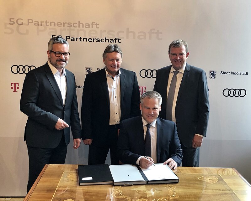 Ingolstadt übernimmt als eine der ersten Städte in der Bundesrepublik die Vorreiterrolle für das superschnelle 5G-Mobilfunknetz. Das Testfeld soll ab 2020 Schritt für Schritt in Ingolstadt eingerichtet werden. Herr Peter Steiner, Geschäftsführer der Audi Electronic Venture GmbH, Herr Martin Knauer, Leider Mobilfunkvertrieb für Geschäftskunden der Telekom, Oberbürgermeister Dr. Christian Lösel und Dr. Reinhard Brandl MdB unterzeichneten die Absichtserklärung.