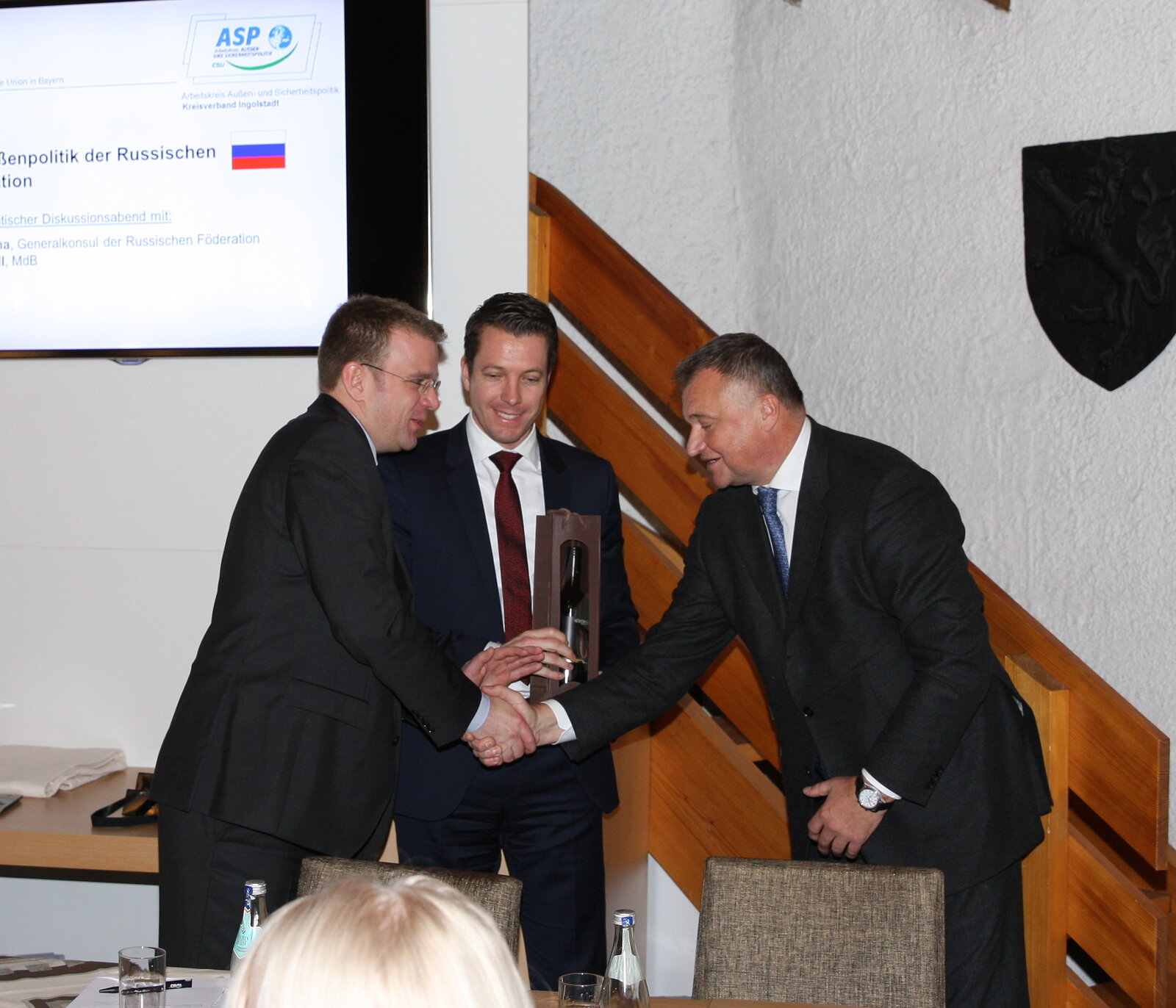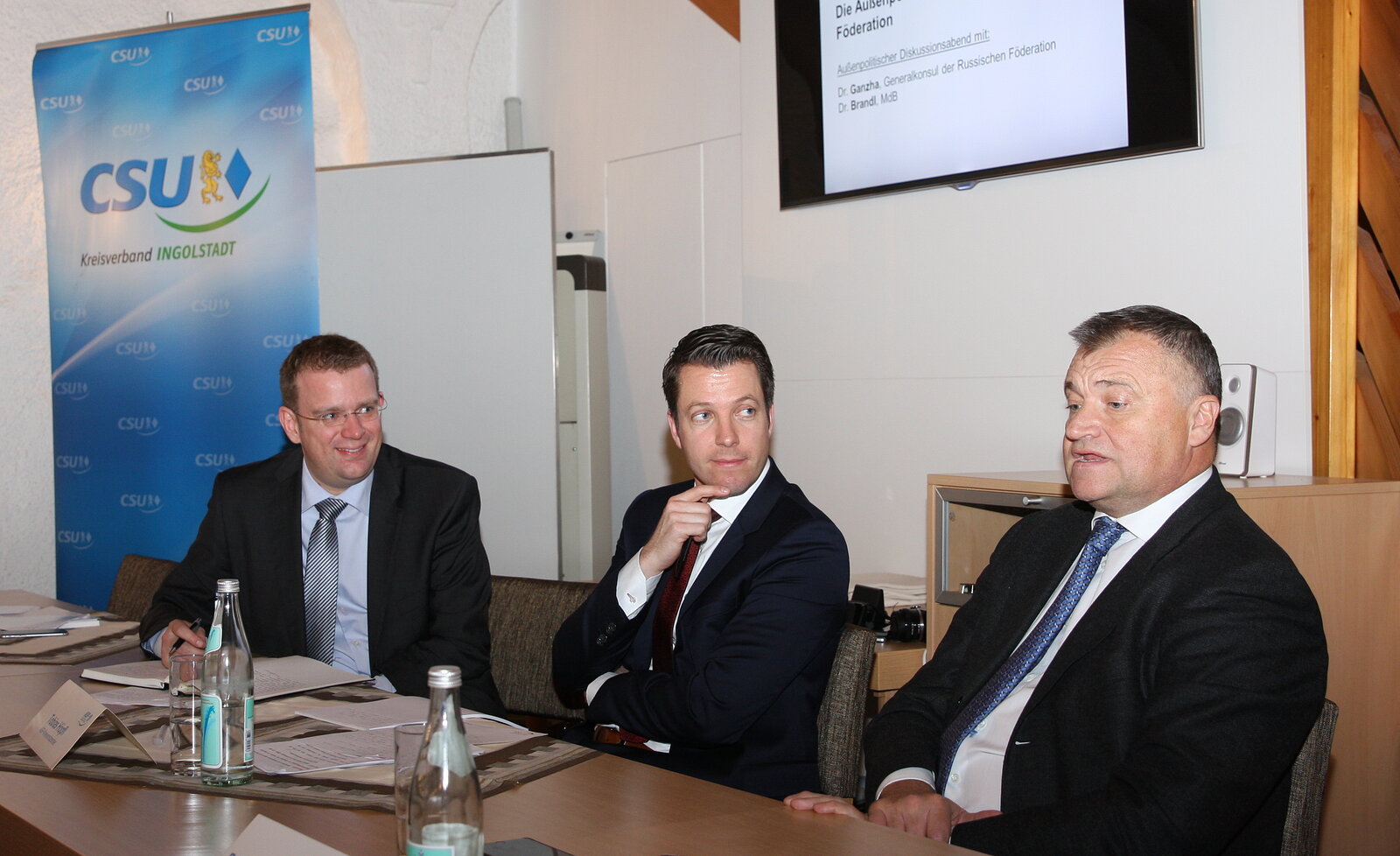 Der Kreisverband des Außen- und Sicherheitspolitischen Arbeitskreises hat am 16.11.2016 zu einer Diskussion zum Thema "Die Außenpolitik Russlands" geladen. Neben Dr. Reinhard Brandl MdB, der den Abend mit einem Impulsreferat einleitete, war auch der Russische Generalkonul Dr. S. Pawlowitsch Ganzha zu Gast.
