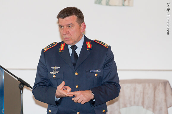 Als ehemaliger Kommodore des Geschwaders 74 in Neuburg konnte Müllner viele bekannte Gesichter im Hotel Kirchbaur begrüßen. In seinem Vortrag zog er den Bogen von weltpolitischen Entwicklungen über die Folgen für die Bundeswehr bis hin zu den direkten Auswirkungen auf den Luftwaffenstützpunkt Neuburg.