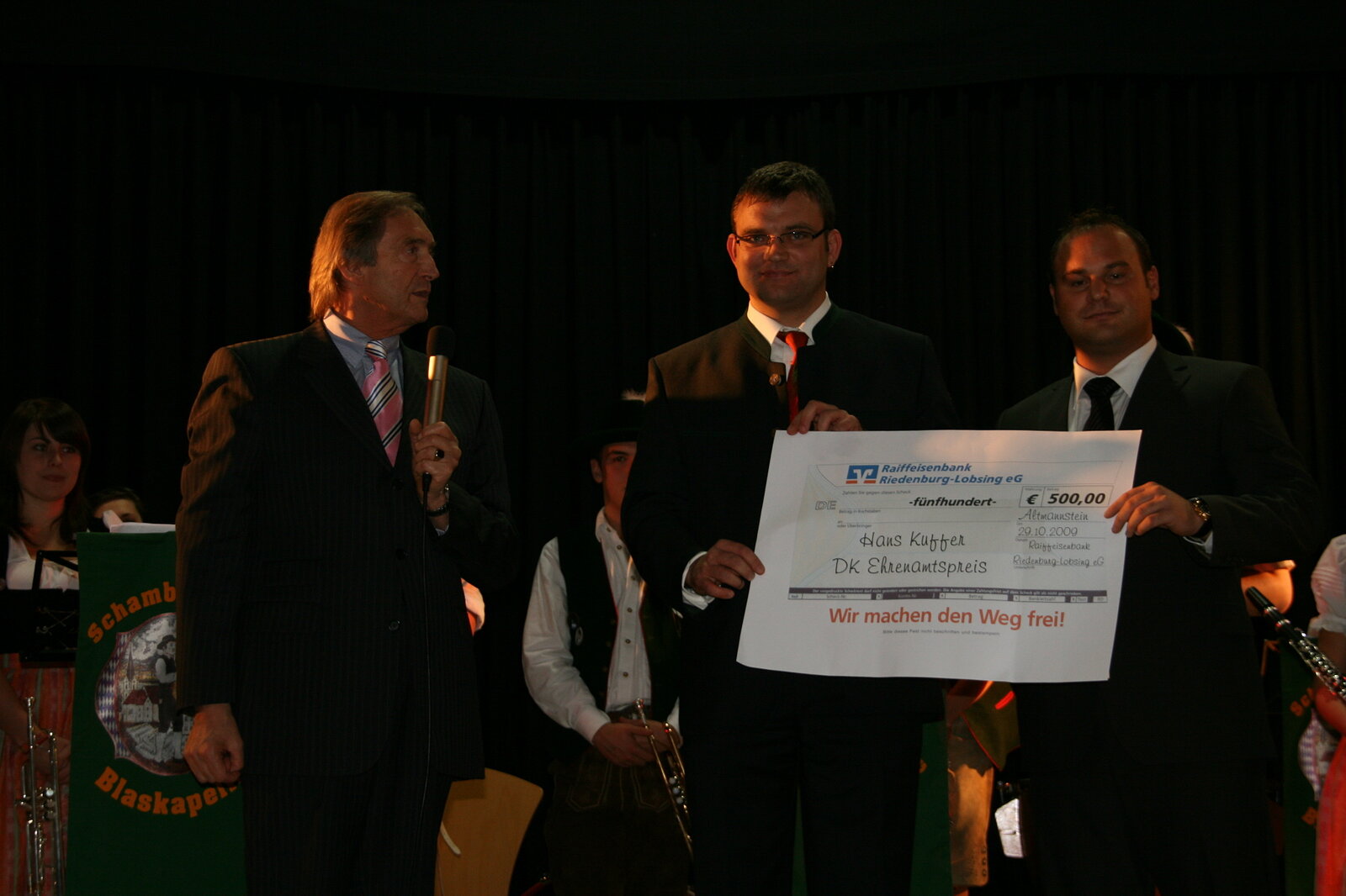 400 Gäste kamen am Samstag, den 31. Oktober 2009 zur Benefizgala zu Gunsten der Kindergärten in Altmannstein, um die ehrenamtliche Arbeit in der Region zu würdigen. Unter dem Motto "Engagement macht stark – Alt und Jung bauen an einer kinderfreundlichen Gemeinde mit! Auch Sie" haben die Ehrenamtspreisträger des Donaukuriers Franz Krupka und Hans Kuffer ein abwechslungsreiches Programm auf die Beine gestellt, dass die Erwartungen der Gäste noch weit übertroffen hat. Ein Höhepunkt des Abends war die offizielle Übergabe des Preisgeldes des DK-Ehrenamtspreis 2008 an Hans Kuffer, dem Leiter der Schambachtaler Blaskapelle. Auch der Bundestagsabgeordnete Dr. Reinhard Brandl zeigte sich begeistert von der Organisation des Abends und freute sich darüber, dass sich so viele Bürgerinnen und Bürger in seinem Bundeswahlkreis ehrenamtlich engagieren.