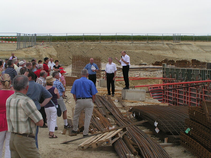 Etwa 150 Gaimersheimer Bürger und Bürgerinnen waren der Einladung des CSU-Ortsverbandes und der CSU-Gemeinderatsfraktion gefolgt und informierten sich über den Baufortschritt am Standort des Gymnasiums Gaimersheim. Zu diesem Ortstermin konnte Fraktionschef Anton Meyer neben Landrat Anton Knapp und dem Bau leitenden Architekten Anton Rudolf auch Bundestagskandidat Dr. Reinhard Brandl begrüßen. Landrat Anton Knapp, der auch Vorsitzender des Zweckverbandes „Gymnasium Gaimersheim“ ist, informierte die Anwesenden zunächst über die Vorgeschichte, den Kostenaufwand und über die Zusammensetzung des Zweckverbandes. Der Anstoß zur Errichtung eines Gymnasiums in Gaimersheim sei im Jahre 2007 gegeben worden. Der Spatenstich konnte bereits nach 18 Monaten Planung erfolgen. Im September 2010 soll mit drei Jahrgängen, also mit zwölf Klassen, der Schulbetrieb aufgenommen werden. Insgesamt rechne man in den Folgejahren mit bis zu 1000 Schülern. Das Areal, auf dem die Schule gebaut wird, habe eine Fläche von fünf Hektar. Der Kostenaufwand sei auf 25 Millionen Euro veranschlagt. Das Zweckverbandsgremium bestehe aus sechs Mitgliedern: Vier aus dem Kreis Eichstätt (Landrat Knapp, Bürgermeister Peter Doliwa, Buxheim, Bürgermeister Michael Stampfer, Eitensheim und Alexander Heimisch, Gaimersheim) und zwei aus der Stadt (Oberbürgermeister Alfred Lehmann und Kulturreferent Gabriel Engert). Über die technischen Einzelheiten des Bauvorhabens informierte Bauleiter Anton Rudolf. Das dreigeschossige Gebäude habe zwei Innenhöfe. Im Osten des Areals befinden sich die Bus- und PKW-Parkplätze. Das Gelände sei durch eine eigene Stichstraße erschlossen. Im Anschluss an das Schulgebäude werde im Westen eine großzügige Sportanlage errichtet. Die Funktionsräume befinden sich im Norden, auf der Südseite seien die Klassenzimmer aufgereiht. Beheizt werden die Räume durch Erdwärme, ergänzt von einer Pelletsheizung.