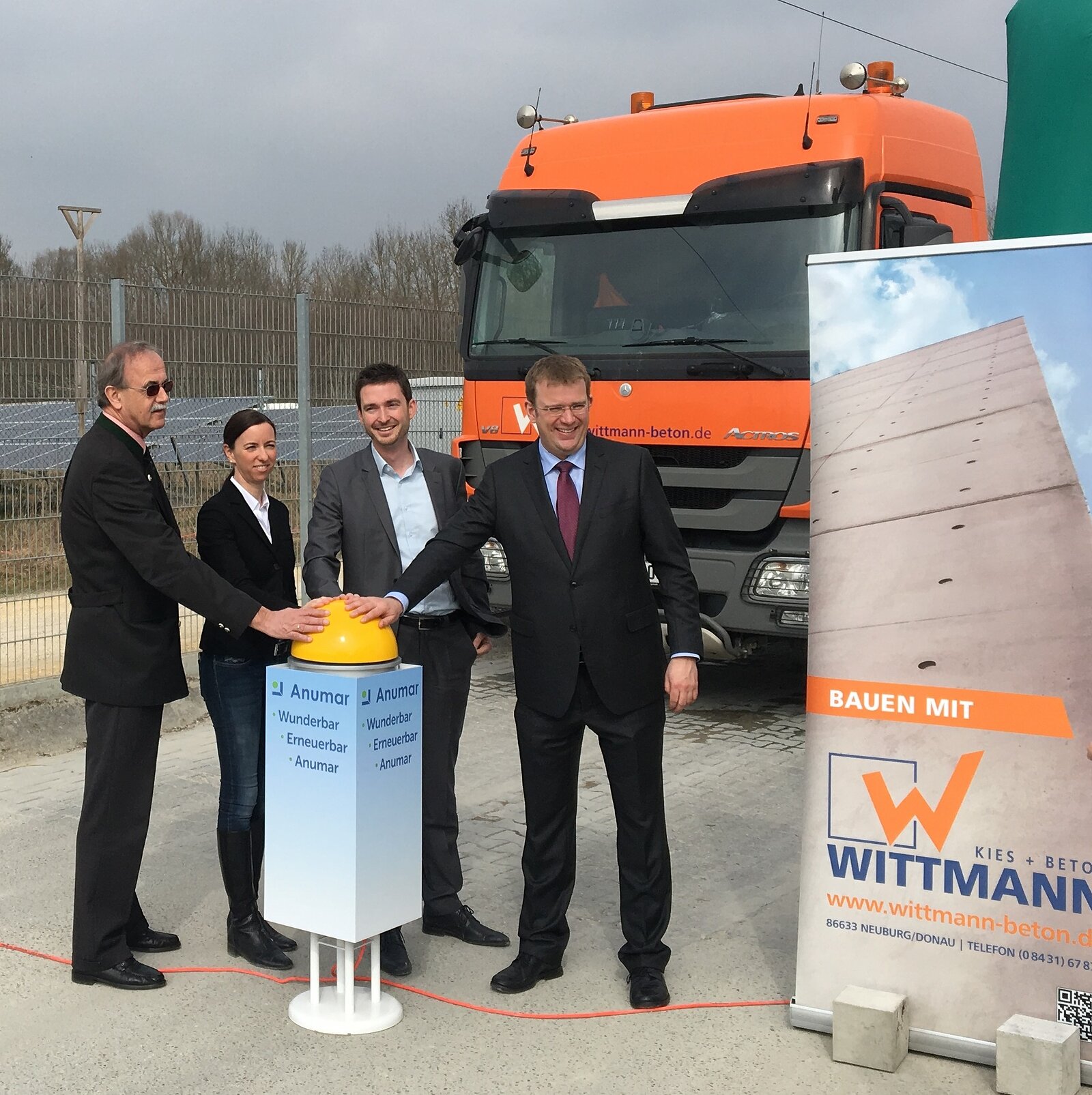 Der Solarpark in Neuburg-Grünau der Firma Anumar erzeugt seit zwei Jahren Sonnenstrom. Die benachbarte Firma Wittmann Kies und Beton hat nun mit der Firma Anumar einen Koopertationsvertrag geschlossen und nimmt jährlich 200.00 Kilowattstunden Strom ab. Dies deckt ein Drittel des Strombedarfs der Firma Wittmann ab. Der Rest wird weiterhin von den Stadtwerken Neuburg bezogen. Zum symbolischen Knopfdruck war neben der Familie Wittmann und Andreas Klier von der Anumar GmbH auch Bürgermeister Rüdiger Vogt und MdB Dr. Reinhard Brandl gekommen. Der Abgeordnete bezeichnete das Projekt "als ein Musterbeispiel an regionaler Wertschöpfung".