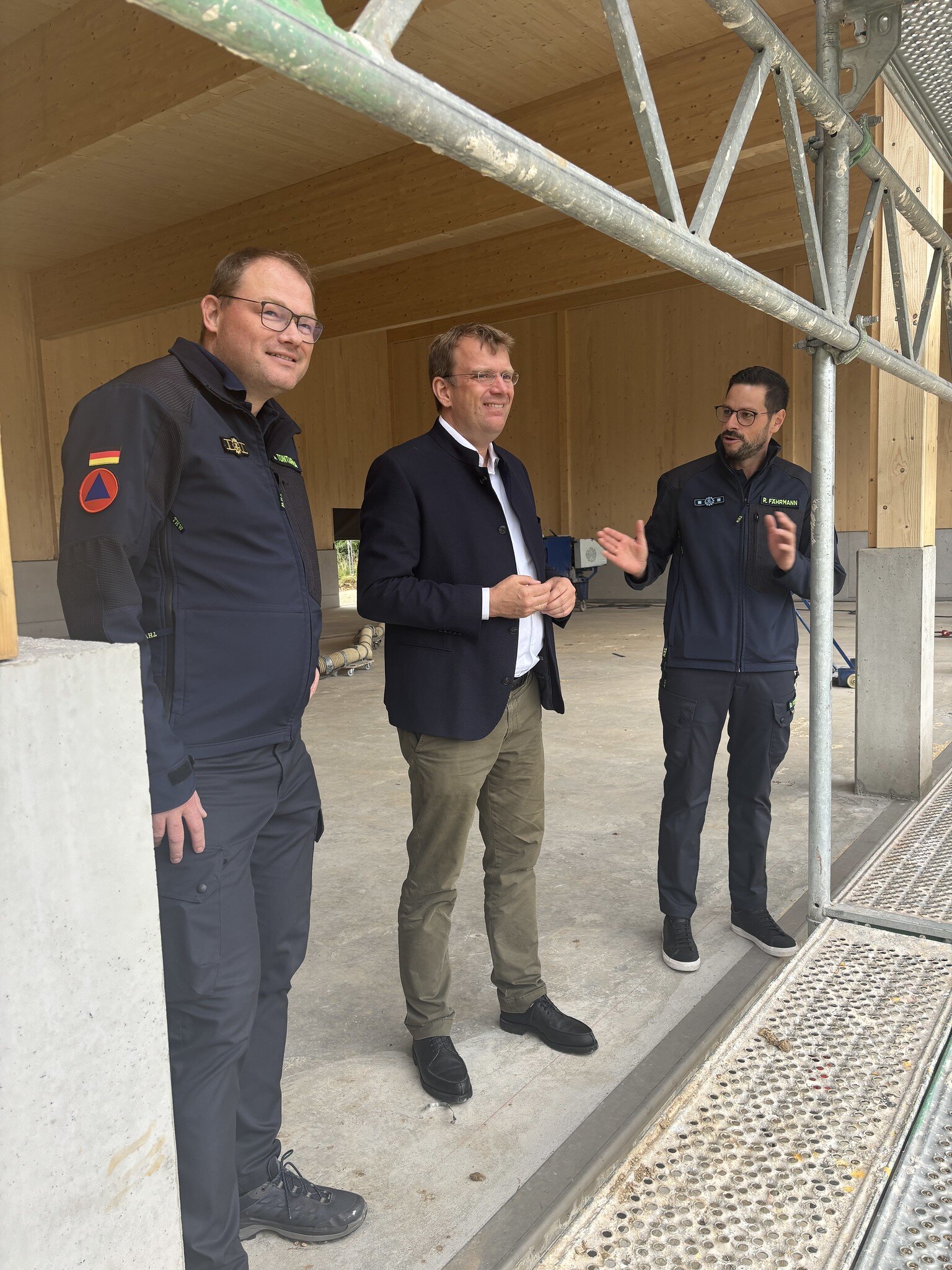 Das Technische Hilfswerk Eichstätt erhält eine neue Unterkunft. Direkt an der Altmühl entsteht ein neuer Bau mit Garagen, Lager-, Schulungs- und Aufenthaltsräumen für den Ortsverband. Ortsbeauftragter Christian Tontarra und Zugführer Ralf Fährmann nutzten die Gelegenheit, Reinhard Brandl bei einem Rundgang über die laufenden Baumaßnahmen zu informieren. Besonders beeindruckend ist hierbei die Verbindung von Nachhaltigkeit und Funktionalität. Für den Neubau wurde viel Holz verwendet, das unverkleidet auch für ein positives Raumklima sorgt.