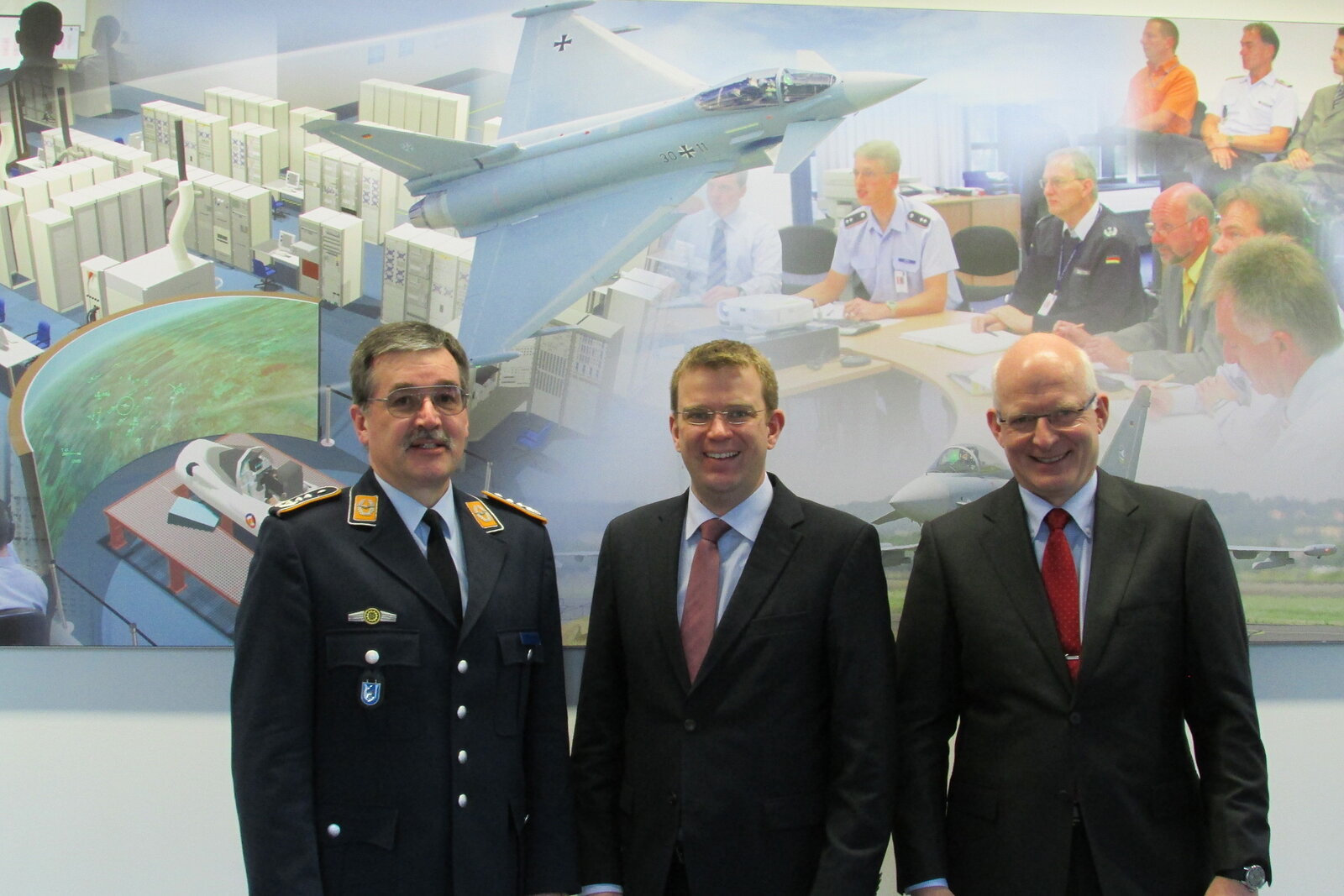 Bei seinem Besuch im Systemunterstützungszentrum Kampfflugzeuge in Manching wurde MdB Dr. Reinhard Brandl von Oberst Stefan Schmid-Schickardt und dem Vertreter des zivilen Bereichs des Unternehmens, Herrn Thomas Hirsch, herzlich begrüßt. Der Abgeordnete informierte sich vor Ort und besichtigte das Unternehmen.