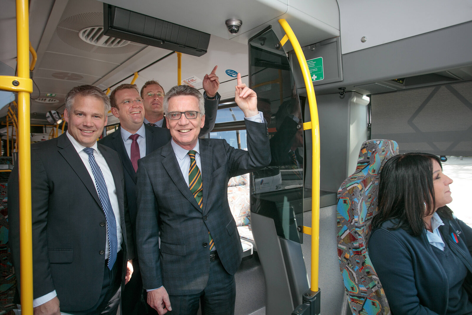 Bundesinnenminister Dr. Thomas de Maiziére überzeugte sich in der INVG-Leitstelle am Ingolstädter Nordbahnhof von der hohen Leistungsfähigkeit des kamerabasierten Sicherheitssystems in Ingolstadt. Oberbürgermeister Dr. Christian Lösel kündigte einen weiteren Ausbau des Systems für Ingolstadt an. Im Fachgespräch mit den Verantwortlichen informierte sich der Minister vor Ort und besuchte sowohl die Leitstelle der INVG als auch einen INVG-Linienbus. Der Minister lobte das Ingolstädter Sicherheitssystem und bezeichnete die Technik als "vorbildlich".