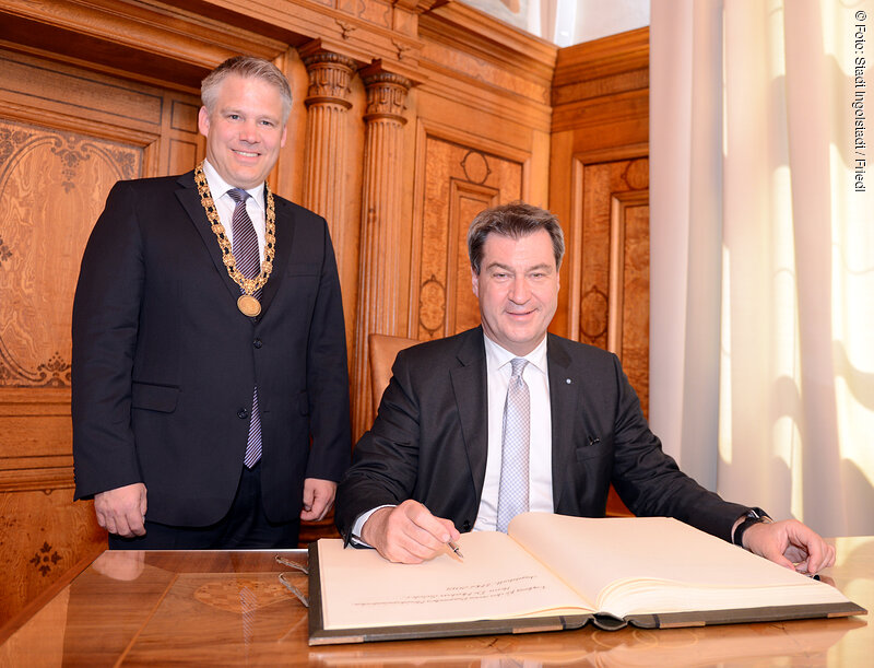 Zum Antrittsbesuch kam Bayerns Ministerpräsident Dr. Markus Söder nach Ingolstadt. Oberbürgermeister Dr. Christian Lösel begrüßte den Gast herzlich und hatte aus diesem Anlass zu einem Festakt in den Historischen Sitzungssaal die Mitglieder des Stadtrates, Vertreter von Behörden und Wirtschaft sowie aus der Politik eingeladen. Gerne war auch Dr. Reinhard Brandl MdB gekommen und wohnte dem Eintrag des Ministerpräsidenten ins Goldene Buch der Stadt Ingolstadt bei.