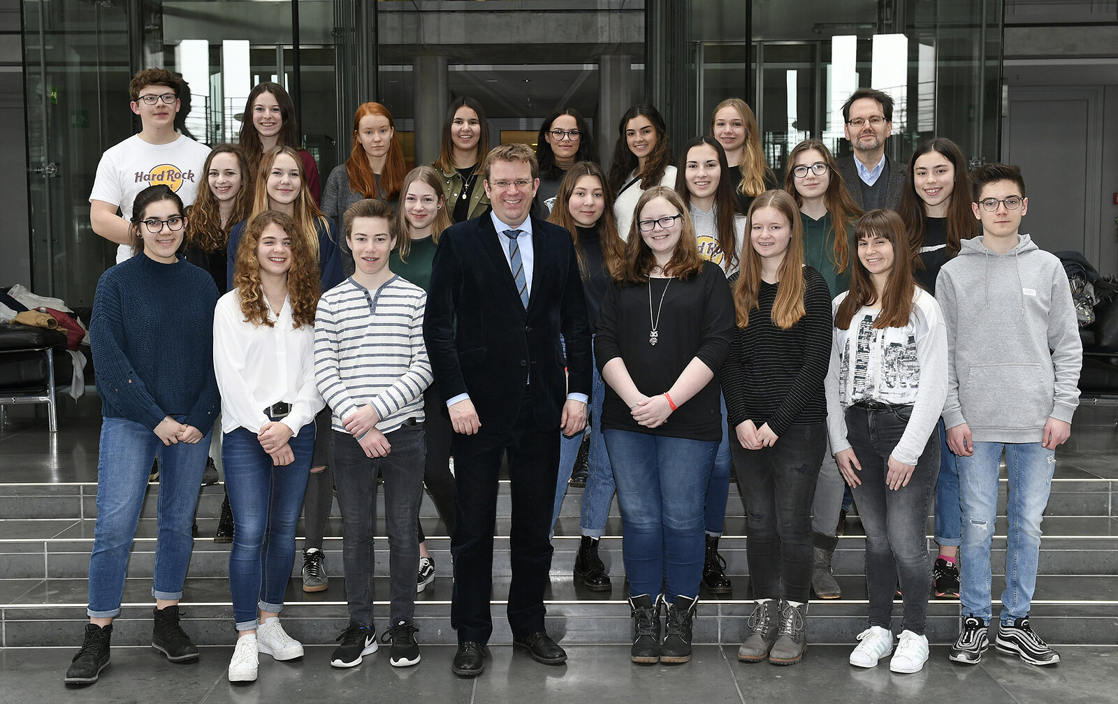 Die Schülerinnen und Schüler der 10. Klassen des Gnadenthal-Gymnasiums Ingolstadt besuchten die Bundeshauptstadt. Auf dem Porgramm stand auch der Besuch des Reichstages. Bei einem Vortrag auf der Besuchertribüne des Plenarsaales erfuhren die Gäste viel Wissenswertes über die wechselvolle Geschichte des Hauses sowie die Arbeitsweise des Deutschen Bundestages. Gerne hieß der Heimatabgeordnete Dr. Reinhard Brandl die Gäste an seinem Berliner Arbeitsplatz willkommen. Im Paul-Löbe-Haus stand er den Schülerinnen und Schülern für ein Gespräch zur Verfügung. Abschließend wünschte er den Gästen noch schöne und ereignisreiche Tage in Berlin und eine gute Heimkehr.