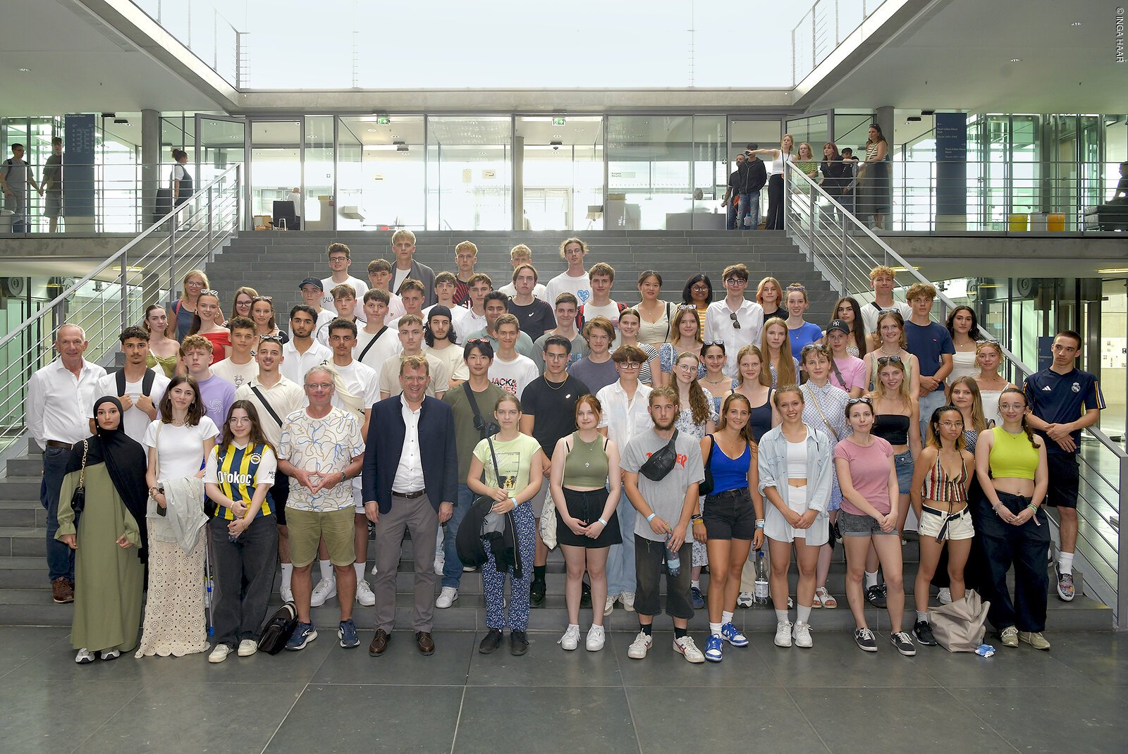 Es war schon etwas später am Nachmittag als Reinhard Brandl die vierte Besuchergruppe des Tages im Bundestag empfing. Doch das hat dem Gespräch nichts abgetan. Die Fragen waren trotzdem zahlreich und die Schülerinnen und Schüler des Christoph Scheiner Gymnasiums waren wach und neugierig.