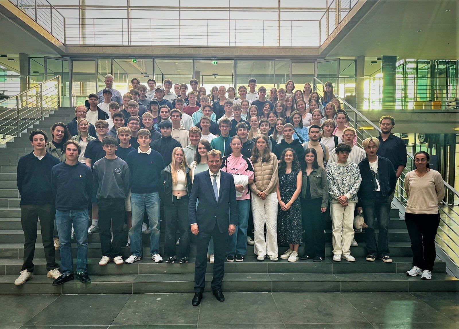 Gute Ausblicke und spannende Gespräche, das hat die Schülerinnen und Schüler des Apian Gymnasiums im Bundestag erwartet. Reinhard Brandl hat über seine Arbeit als Abgeordneter gesprochen und Fragen zur aktuellen politischen Lage beantwortet.