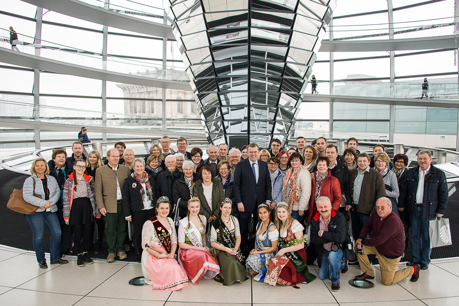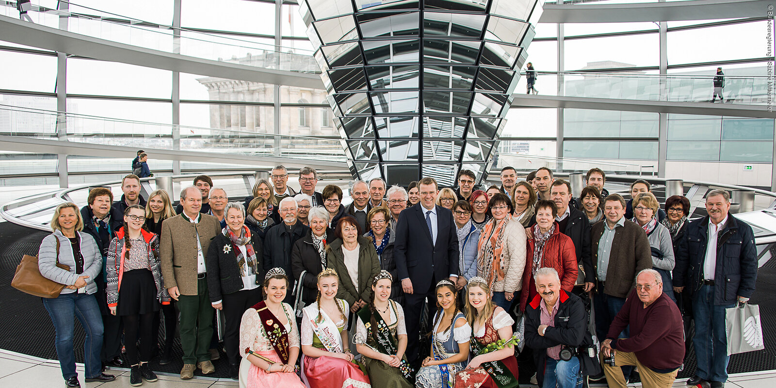Diese Woche hatte Dr. Reinhard Brandl eine Besuchergruppe aus dem Wahlkreis zu Gast im Deutschen Bundestag. Unter den Gästen waren auch fünf Produktköniginnen, der Festausschuss für das Jubiläum "700 Jahre Hepberg" sowie Gewinner von Gutscheinen. Auf dem Programm stand neben dem Besuch des Reichstages auch ein Gespräch im Bundesministerium für Ernährung und Landwirtschaft, bei der Berliner Vertretung des Europäischen Parlaments und eine Stadtrundfahrt. Einer der Höhepunkte der Reise war der Besuch im Bundeskanzleramt. Ein Vortrag über die Aufgaben der Landesvertretung Bayern rundete das Programm ab. MdB Dr. Reinhard Brandl begrüßte die Gäste bereits am Sonntag Abend im Deutschen Bundestag und führte die Gruppe durch das Reichstagsgebäude.