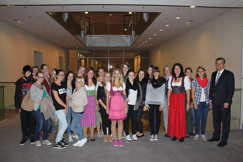 Zwei Tage nach der Bundestagswahl konnte MdB Dr. Reinhard Brandl bereits eine Besuchergruppe aus Ingolstadt herzlich willkommen heissen. Die jungen Damen der Gnadenthal-Mädchen-Realschule waren im Dirndl zum Besuch des Heimatabgeordneten gekommen. Reinhard Brandl freute sich sehr über den Besuch der beiden Schulklassen, die unter der Leitung des Klassenlehrers Josef Herrmann eine Exkursion in die Bundeshauptstadt unternommen hatten. Nach dem einstündigen Gespräch mit dem Abgeordneten stand noch ein Besuch auf der Reichstagskuppel auf dem Programm.