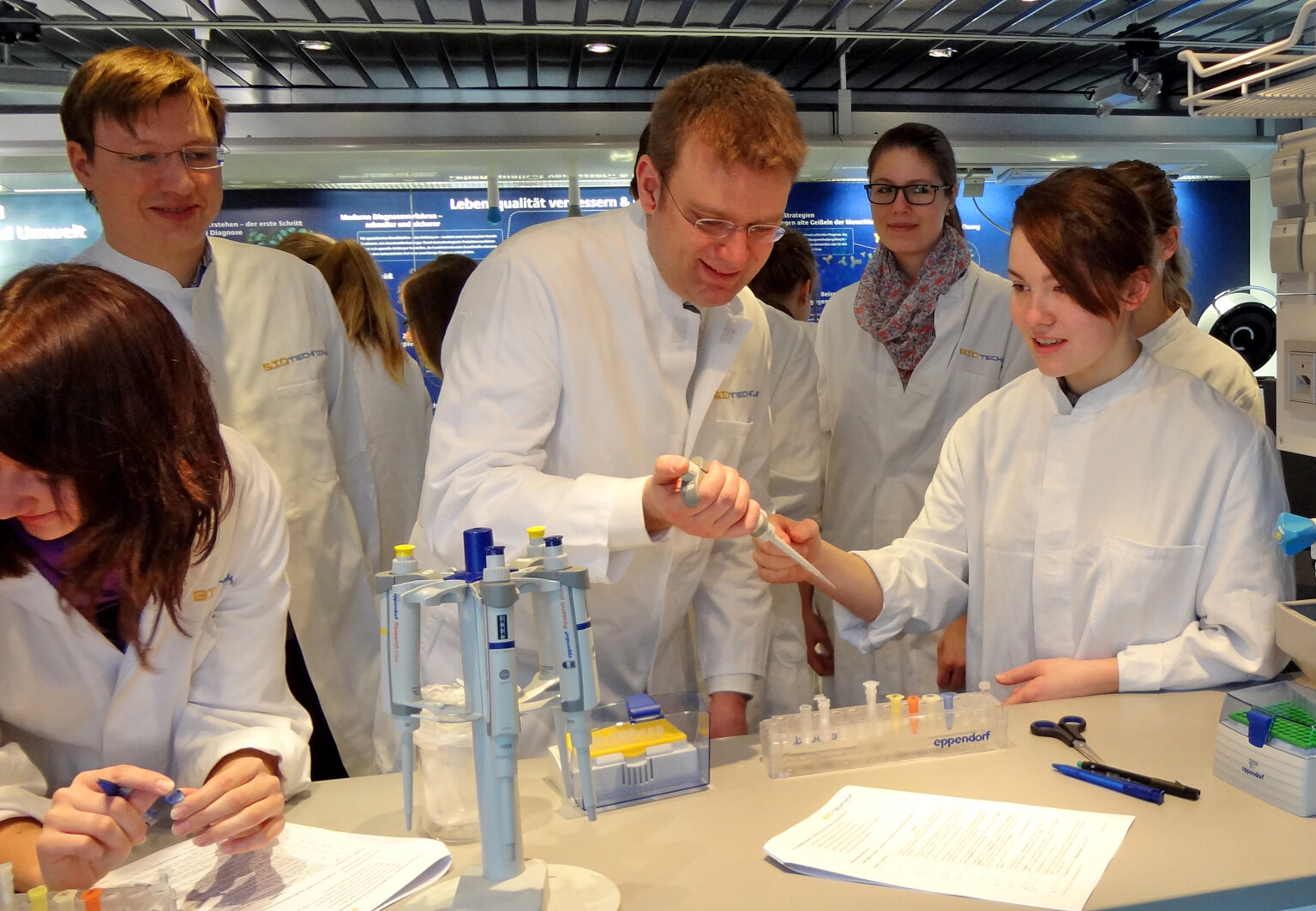 Im Schulhof des Descartes-Gymnasium Neuburg parkte zwei Tage der große Truck des Bundesbildungsministeriums und informierte über Biotechnologie. Die Schülerinnen und Schüler hatten die Möglichkeit im doppelstöckigen Truck ein komplettes Labor zu nutzen. Aus der eigenen Mundschleimhaut schabten die Schüler einige Zellen ab, aus denen sie ihre DNS - also ihre Erbinformationen - gewinnen konnten. Sehr interessiert war auch MdB Dr. Reinhard Brandl an diesem Projekt und frischte seine Kenntnisse in Biologie und Chemie auf.