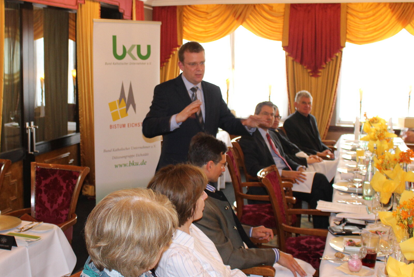 MdB Brandl beim BKU Bundestagsabgeordneter Dr. Reinhard Brandl besuchte kürzlich den BKU Bund Katholischer Unternehmer. Anlässlich des regelmässigen Mittagstisches im Parkhotel Heidehof sprach der Abgeordnete über den Beziehungsbogen zwischen der katholischen Soziallehre und den Grundeinstellungen eines CSU Politikers. Dr. Brandl zeigte anhand der Politikfelder Steuern, Familie und Soziales das enge Geflecht zur den drei Grundwerten der Soziallehre auf, der Personalität, Subsidiarität und Solidarität. Insbesondere die Eigenverantwortung des Einzelnen steht für viele Werte eines Unionspolitiker Pate. Und hier wird die Parallelität zur katholischen Soziallehre sichtbar. Aus der Tagespolitik schilderte Dr. Brandl, der unter anderem Mitglied des Verteidigungsausschusses ist, seine Sichtweise zur Ukraine-Krise. Stellung bezog der Abgeordnete auch zu kritischen Fragen des BKU und der Wirtschaftsjunioren zur Rente mit 63, die bekanntlich von beiden Organisationen kritisch gesehen wird. Der Diözesanvorsitzende Reinhard Dirr dankte Dr. Brandl für die tiefgründige Tischrede und den zahlreichen Unternehmern, Managern und Führungskräfte für den Besuch.