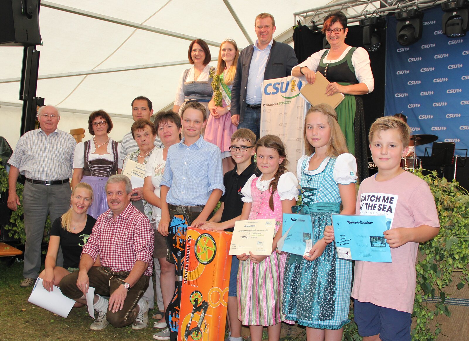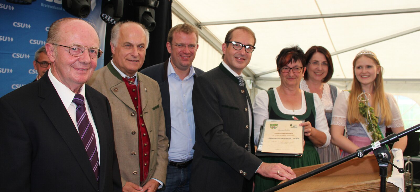 Bereits zum 38. Mal fand in Haunstetten das Hopferzupferfest statt. Am Sonntag Nachmittag kam als Ehrengast der Bundesminister für Verkehr und digitale Infrastruktur Alexander Dobrindt. Nach dem Eintrag ins Goldene Buch des Marktes Kinding sprach der Minister in seiner Rede aktuelle politische Themen an. Zum Thema Diesel kritisierte der Minister eine "Enteignung" der Käufer, die vor einem künftig wertlosen Auto stünden. "Fahrverbote für Dieselfahrzeuge wird es vorerst nicht geben" so Dobrindt. Als Leuchtturmprojekt bezeichnete er die digitalen Teststrecken auf der A 9. CSU-Ortsvorsitzender Josef Pfaller, CSU-Kreisvorsitzende Tanja Schorer-Dremel, Bürgermeisterin Rita Böhm, Hopfenkönigin Rebecca Wolfsteiner, Bezirksrat Reinhard Eichiner und MdB Dr. Reinhard Brandl bedankten sich bei Bundesminister Alexander Dobrindt für seine Kommen und seine Rede. Im Anschluß fand noch die Verteilung der Preise aus der Verlosung statt. Viele Gäste freuten sich über atrtraktive Gewinne, darunter eine vier-tägige Berlin-Fahrt, gestiftet von MdB Dr. Reinhard Brandl.