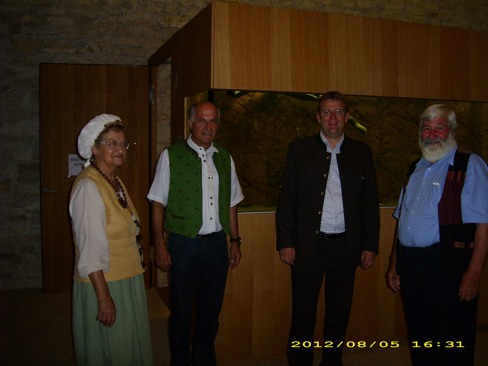 Am Altmühlufer neben der Burg fand wieder das traditionelle Burgfest in Dollnstein statt. Der Verein der Burgfreunde Dollnstein konnte in diesem Jahr die von Konrad Kyeser gefertigten Modelle von Kriegsmaschinen sowie das Flussfisch-Aquarium in der Burg offiziell an Bürgermeister Hans Harrer übergeben. MdB Dr. Reinhard Brandl war der Einladung gerne gefolgt und besichtigte im Altmühlzentrum diese Exponate, die erstmals zur Besichtigung freigegeben wurden.