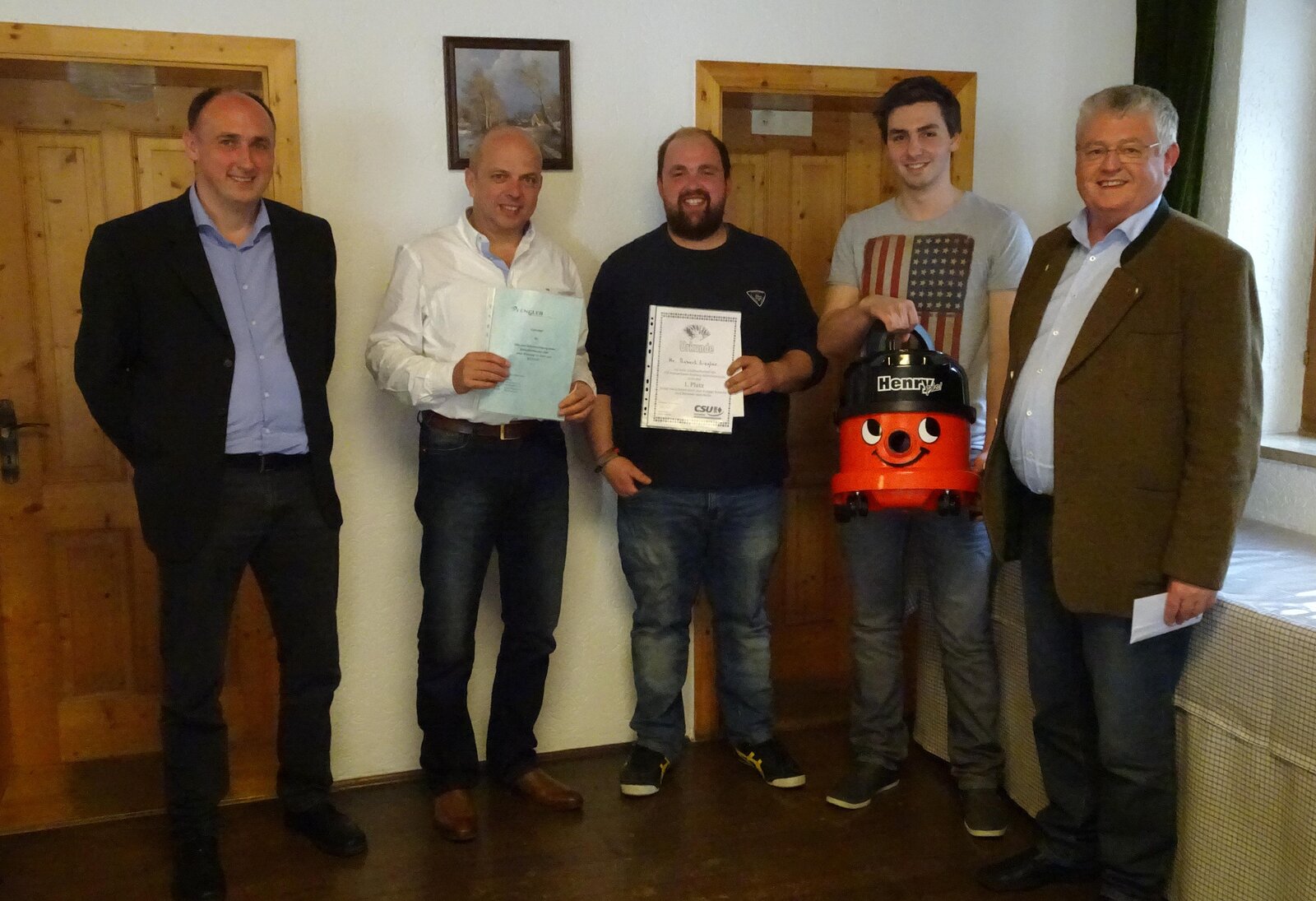 Den zweiten Platz sichert sich Günter Braun aus Heinrichsheim mit 78 Zählern. Er hatte die Wahl zwischen einem Industriestaubsauger und einer Fenster-Komplettreinigung vom Profi. In Sachen Schafkopf scheint er ebenfalls ein Profi zu sein, denn er hatte in den Vorjahren bereits zweimal einen Staubsauger als Preis in Empfang nehmen können und entschied sich deshalb, und vermutlich zur Freude seiner Ehefrau, für die Fensterreinigung. So ging das Elektrogerät an den Drittplatzierten Florian Fischhaber, ebenfalls aus Hohenried (73 Punkte).