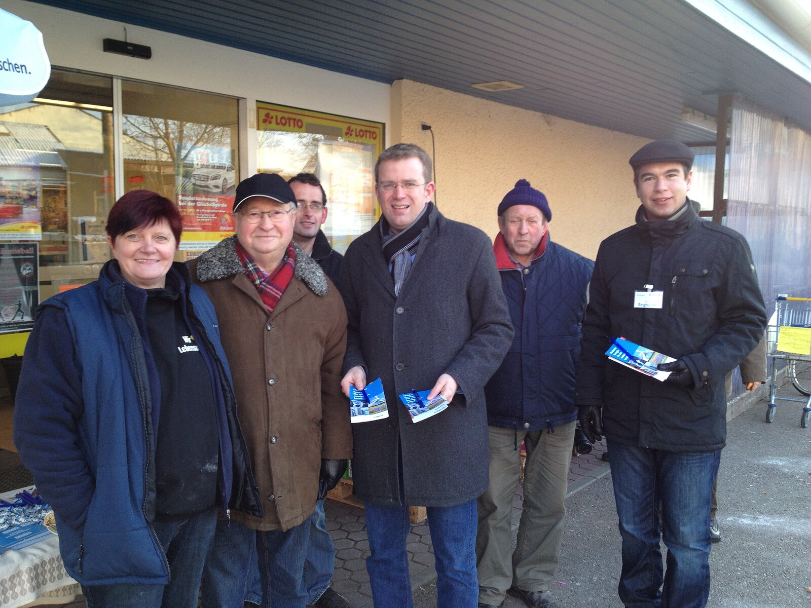 Altbürgermeister Manfred Ludwig hatte einen Informationsstand in Burgheim organisiert, an dem auch MdB Dr. Reinhard Brandl und der Landtagslistenkandidat Matthias Enghuber teilnahmen. Trotz klirrender Kälte konnte die CSU-Mannschaft mit vielen Bürgerinnen udn Bürgern sprechen und Informaitonsmaterial zu allen Feldern der Politik verteilen.