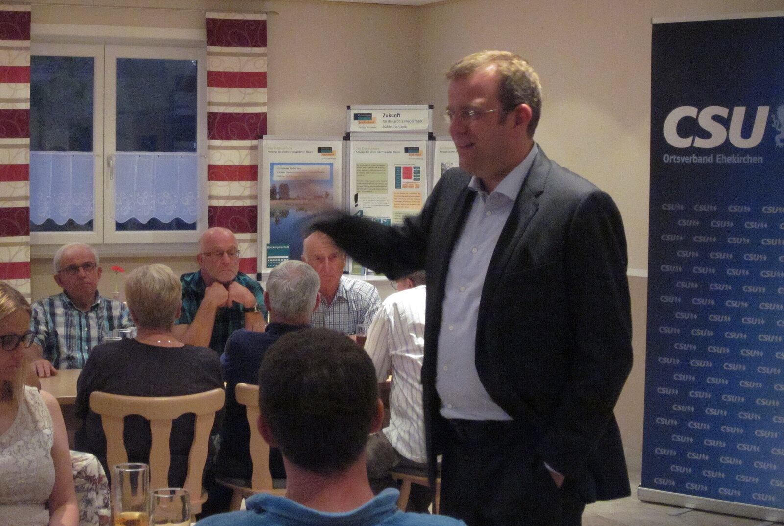 Unter dem Motto "Reinhard Brandl zu Gast in Ehekirchen" fand im Gemeinschaftshaus in Hollenbach eine Wahlversammlung statt. Dazu konnte Ortsvorsitzender Michael Braßler viele Gäste begrüßen und freute sich sehr über den Besuch von MdB Dr. Reinhard Brandl. Der Abgeordnete zeigte in seiner Rede die Erfolge der Bundesregierung in den vergagenen vier Jahren auf. Er ging aber auch auf die Veränderungen in den letzten Jahren weltweit ein. Insbesondere die Flüchlingswelle des vergagenen Jahres nahm breiten Raum in seinen Ausführungen ein. Reinhard Brandl betonte, dass dieses Probleme nicht alleine von deutscher Seite her gelöst werden kann. Ohne eine Sicherung der europäischen Außengrenzen wird dieses Problem nicht in den Griff zu bekommen sein. Gerne stand der Abgeordnete anschließend für Fragen und Gespräche zur Verfügung.