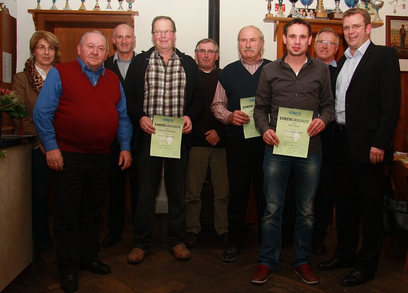 Ortsvorsitzener Dr. Reinhard Brandl nutzte den festlichen Rahmen der alljährlichen Weihnachtsfeier um langjährige Mitglieder der CSU zu ehren. Für die musikalische Weihnachtsstimmung sorgten die Gebrüder Hammerer. Als besonderen Gast hieß R. Brandl die CSU-Kreisvorsitzende Tanja Schorer-Dremel herzlich willkommen. Gemeinsam ehrten sie die Jubilare des Ortsverbandes für ihre langjährige Treue zur CSU. Für 10 Jahre Mitgliedschaft erhielten Wolfgang Dirr, Peter Funk und Stefan Wild eine Ehrenurkunde, ebenso Harald Schneeberger und Ludwig Bauer, die bereits seit 15 Jahren dem Ortsverband angehören. Auf 20 Jahre Mitgliedschaft kann Bürgermeister Michael Stampfer zurückblicken.Für ihre 25jährige Mitgliedschaft wurden Johann Winhard und Franz Kaupert mit einer Anstecknadel und einem graviertem Taschenmesser geehrt. Auch Sebastian Ernst erhielt für seine 35jährige Zugehörigkeit ein Taschenmesser. Nach der offiziellen Ehrung gingen die anwesenden Mitglieder zum gemütlichen Teil über. Mit einer Weihnachtsgeschichte, vorgelesen von Frau Schorer-Dremel und Weihnachtslieder, gespielt von den Gebrüdern Hammerer, klang die Feier festlich aus.