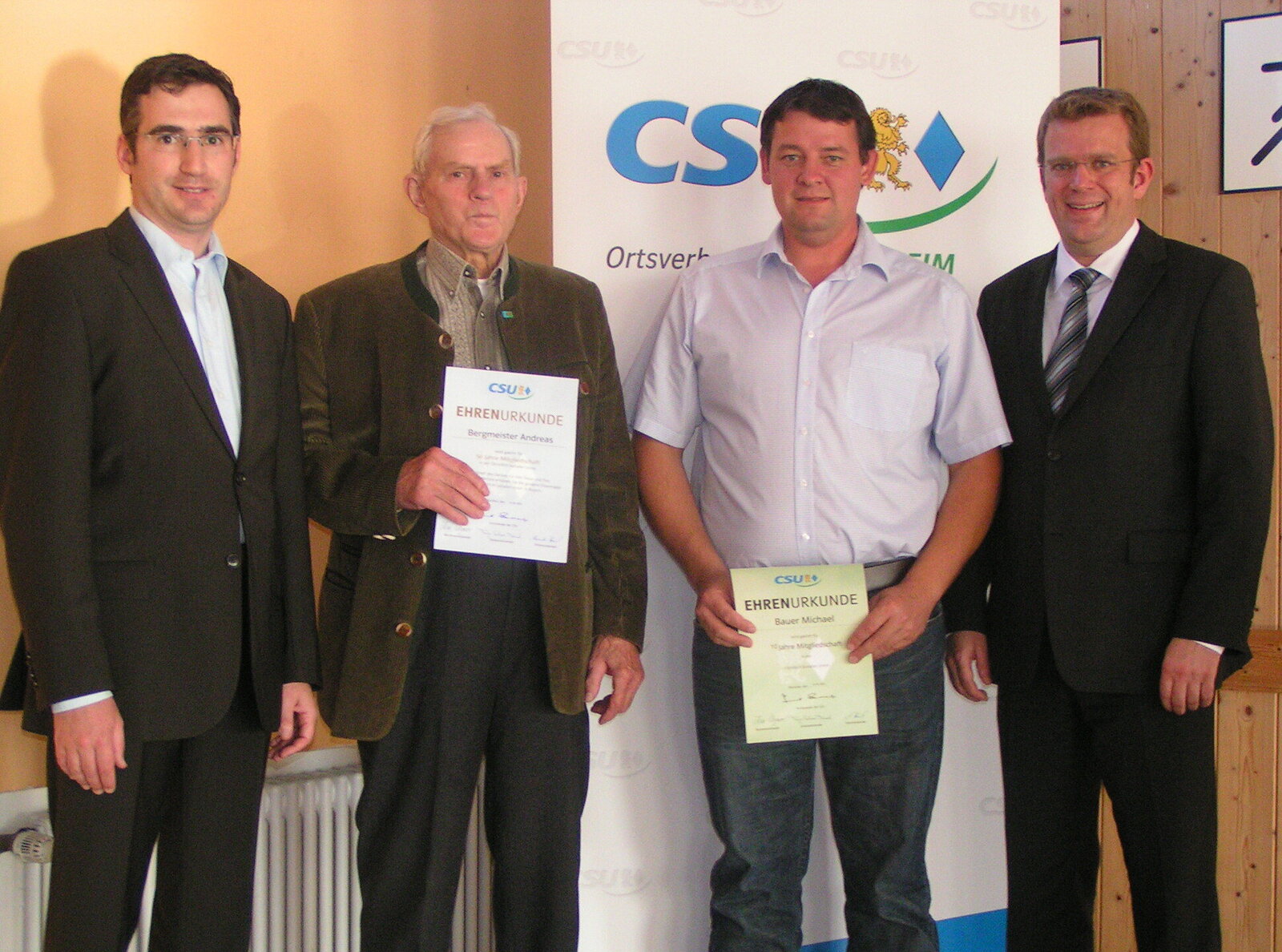Am Ende der Versammlung ehrten Ortsvorsitzender Alexander Heimisch und Brandl zwei Mitglieder: für 10 Jahre Mitgliedschaft Michael Bauer und für 50 Jahre Andreas Bergmeister. Bergmeister erhielt zudem die goldene Ehrennadel der CSU.