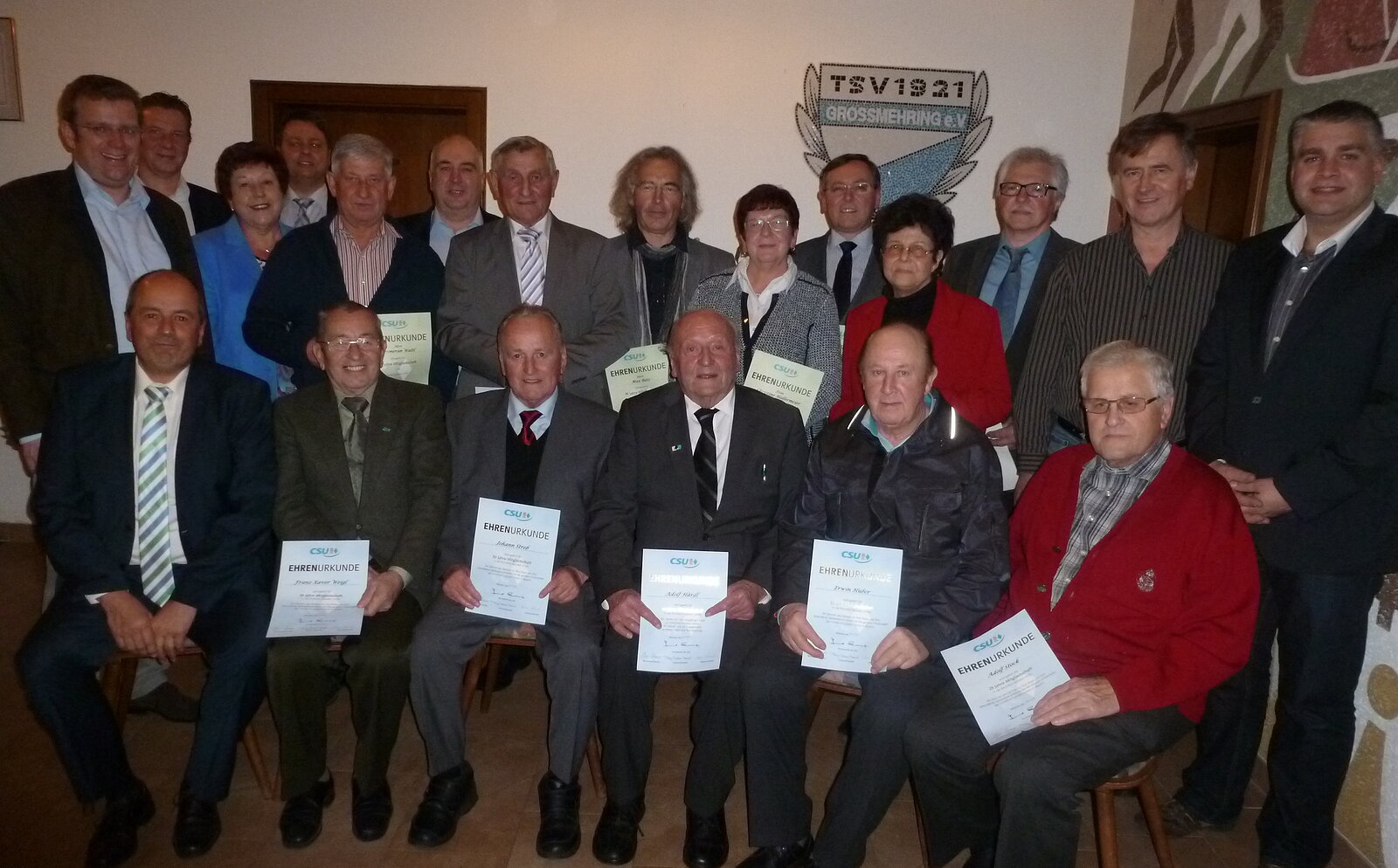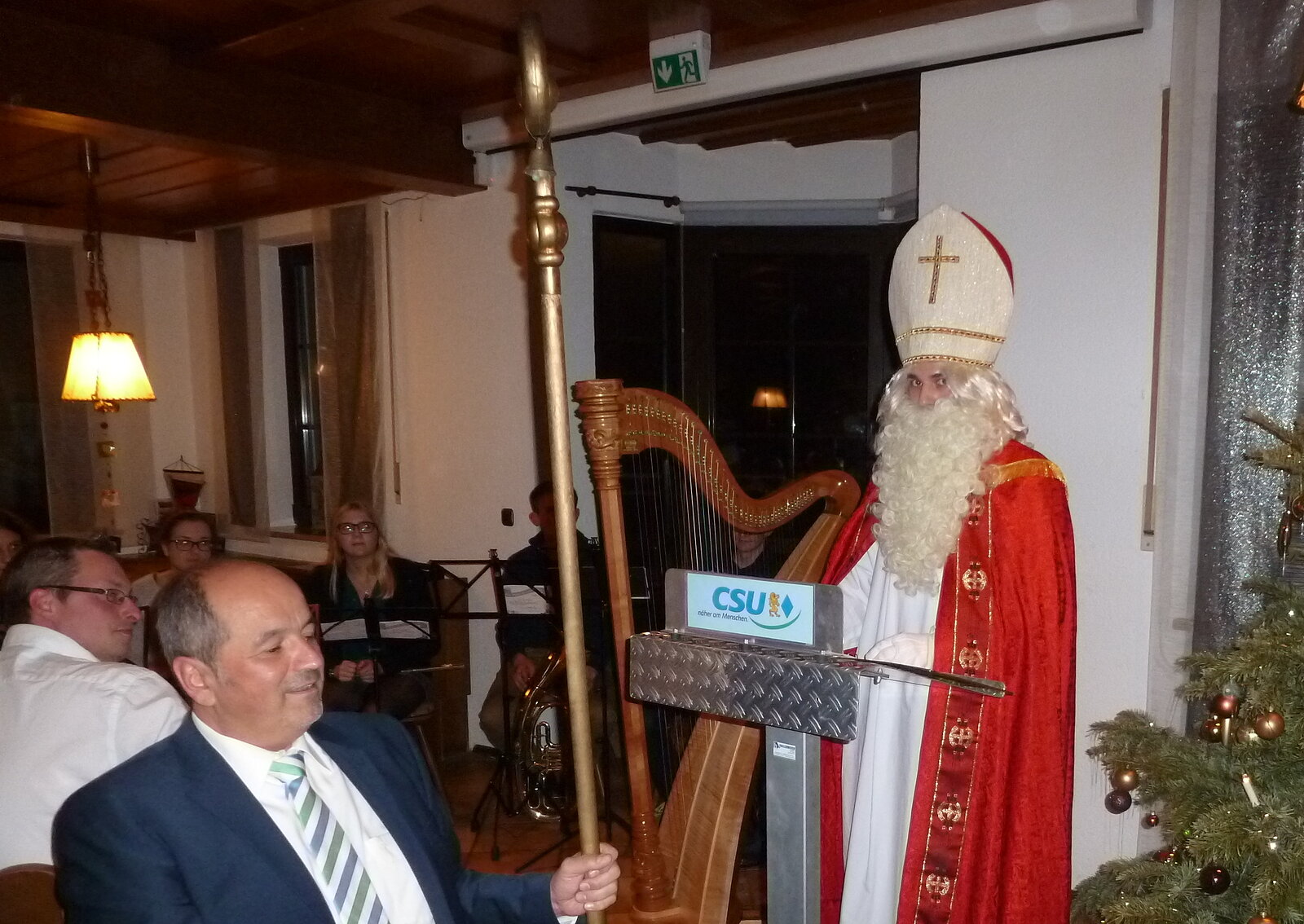 Über 80 Gästen war zur Weihnachtsfeier des CSU-, JU- und FU-Ortsvebanees Großmehring ins Sportheim gekommen. Als Ehrengast konnte Ortsvorsitzender Werner Schneider den Bundestagsabgeordneten Dr. Reinhard Brandl begrüßen, der die Ehrung langjähriger CSU-Mitglieder vornahm, darunter auch Adolf Härtl aus Theissing, der für seine 60-jährige Mitgliedschaft in der CSU eine Urkunde erhielt. Im Laufe des Abends stattete der hl. Nikolaus mit Knecht Rupprecht dem Ortsverband einen Besuch ab. In geselliger Runde klang der Abend aus.