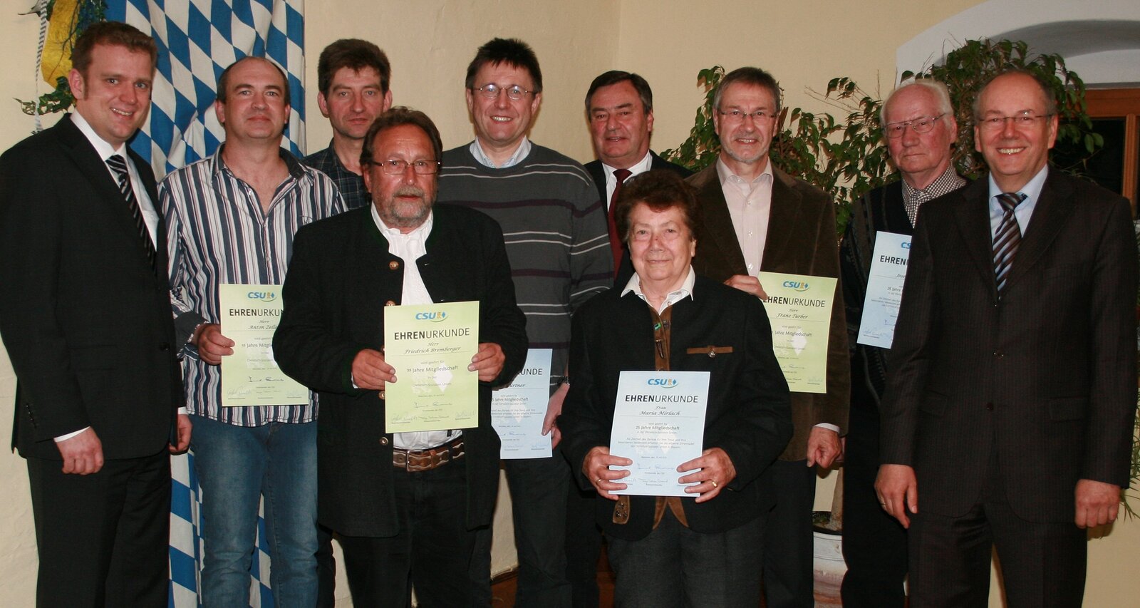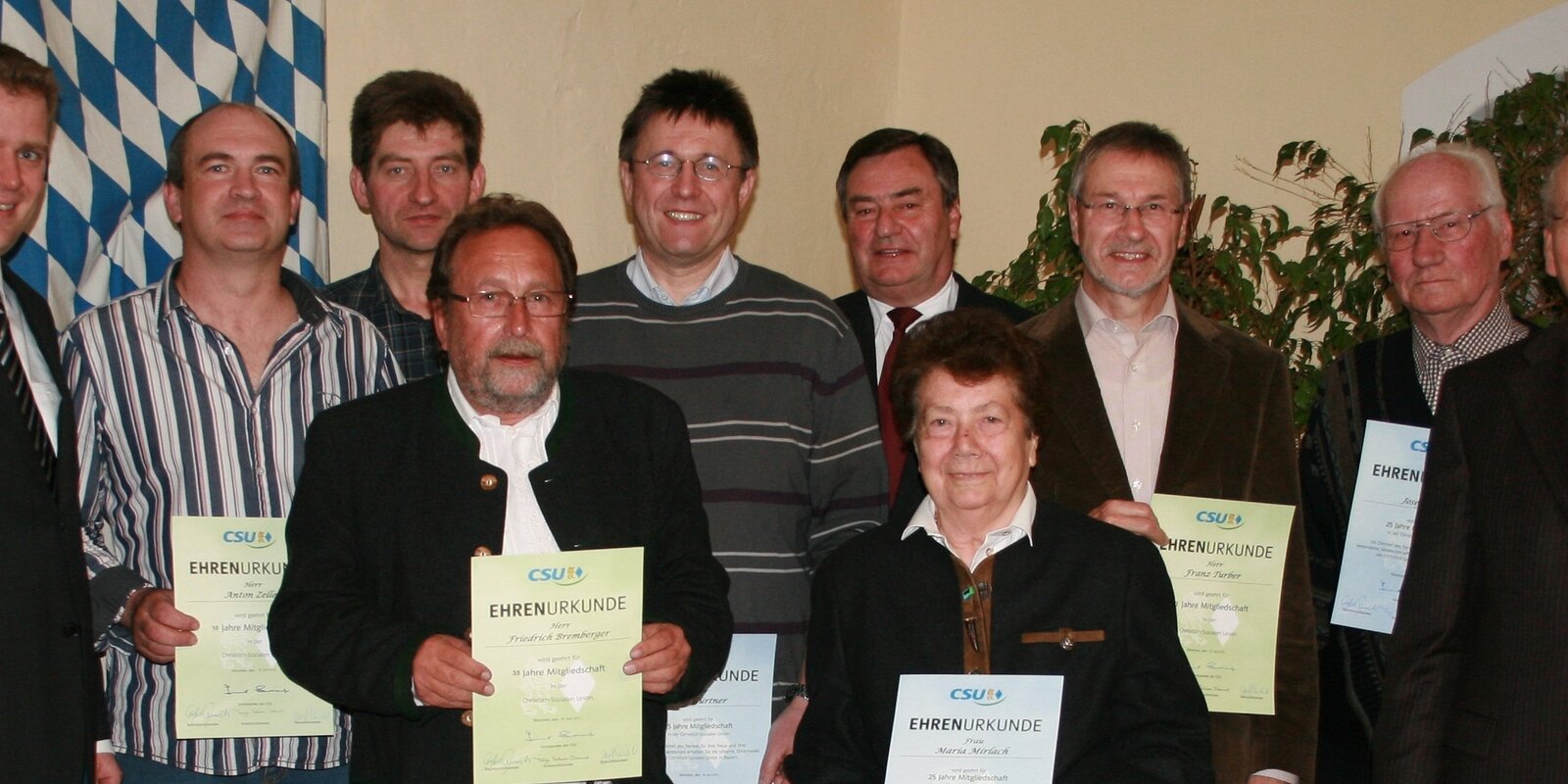 Reinhard Brandl, links und Josef Mirlach, rechts mit den Jubilaren des CSU-Ortsverbandes