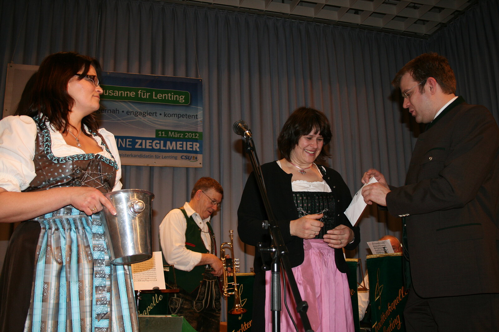 Das traditionelle Starkbierfest des CSU-Ortsverbanes Lenting war in der überfüllten alten Turnhalle wieder ein voller Erfolg. In ihrer Fastenpredikt traf Schwester Argula, alias Heidi Conradt, wieder einmal ins Schwarze. Ortsvorsitzender Josef Mirlach konnte zu später Stunde auch noch MdB Dr. Reinhard Brandl begrüßen, der vom Bockbierfst in Eichstätt noch zu seinen Freunden nach Lenting kam. Gerne hatte er zur Verlosung einen Gutschein für eine 4-tägige Berlin-Reise für 2 Personen mitgebracht, den er dann selbst an die glückliche Gewinnerin, Frau Walburga Hundsdorfer aus Lenting, übergeben konnte. Bürgermeisterkandidatin Susanne Zieglmeier lud die Gäste noch zur Teilnahme an den Veranstaltungen in der letzten Wahlkampfwoche, insbesondere zum Gespräch mit Staatsministerin Christine Haderthauer am 10. März in der Gaststätte Hofmark, ein.