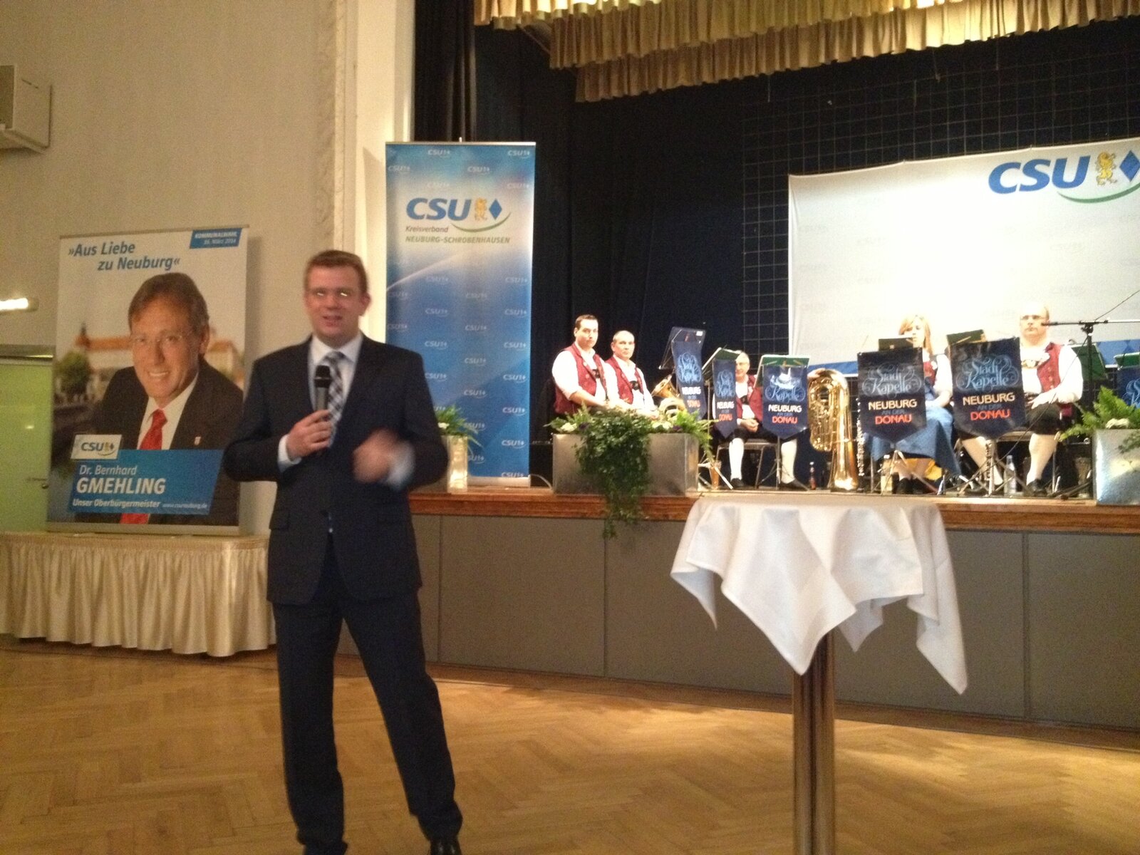 Zum großen Wahlkampfabschluss des CSU-Ortsverbandes Neuburg und des CSU-Kreisverbandes Neuburg-Schrobenhausen konnten die Vorsitzenden Dr. Otto Heckl und Alfred Lengler ein vollbesetztes Kolpinghaus begrüßen. Kurzweilige Interviews mit den Spitzenkandidaten um das Landratsamt, Roland Gaßner und um das Neuburger Rathaus, Dr. Bernhard Gmehling, gaben einen Einblick in die Konzepte der CSU in Stadt und Landkreis. MdB Dr. Reinhard Brandl unterstrich den hohen Wert einer Politik "aus einer Hand": vom Rathaus bis zum Bundestag bietet die CSU für alle Anliegen den richtigen Ansprechpartner und die kürzesten Wege vor Ort. Aus aktuellem Anlass ging Reinhard Brandl auch auf das Thema "Gleichstromtrasse" ein, das den Bürgern aus Bergen, die mit 50 Personen zum Kolpinghaus gekommen waren, Sorgen bereitet. Er sicherte ihnen seine Unterstützung zu und wiederholte den Standpunkt der Bayerischen Staatsregierung, die Notwendigkeit dieser Trasse zu hinterfragen und nach Alternativen zu suchen.
