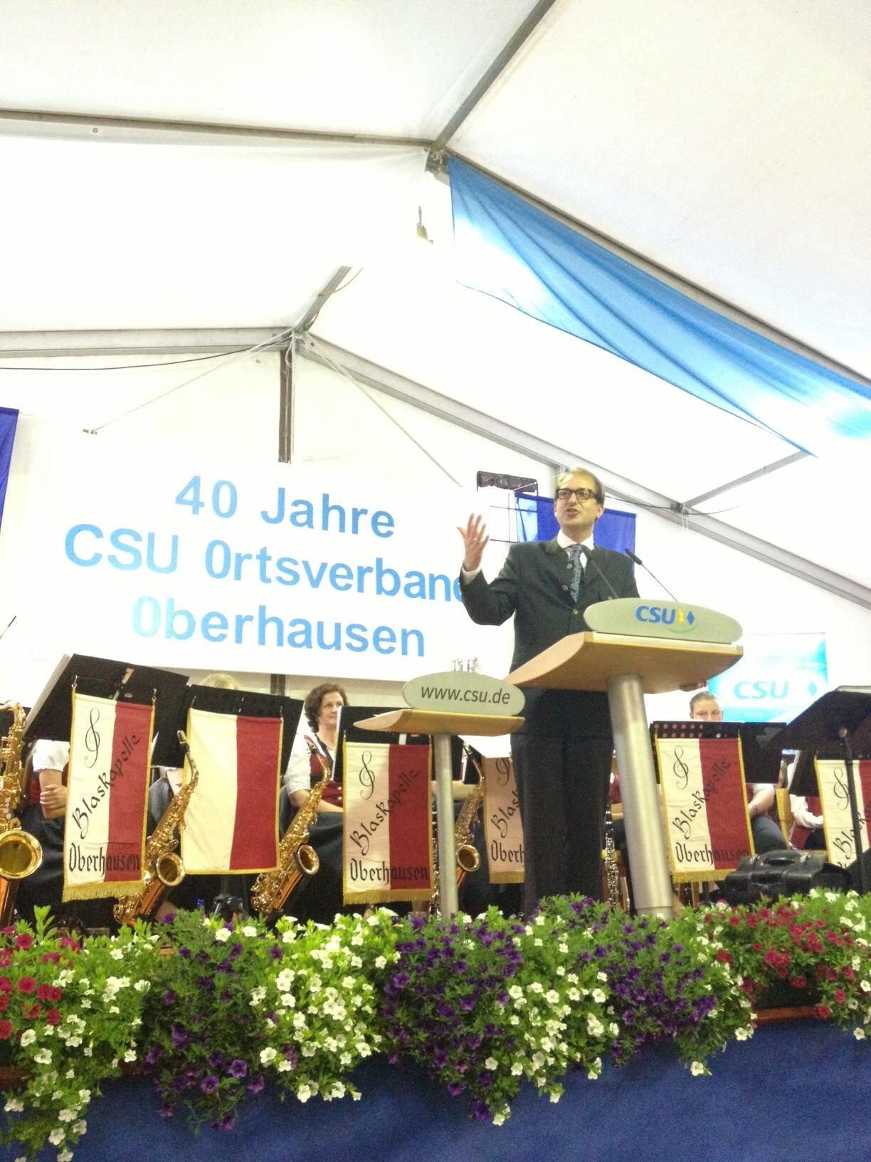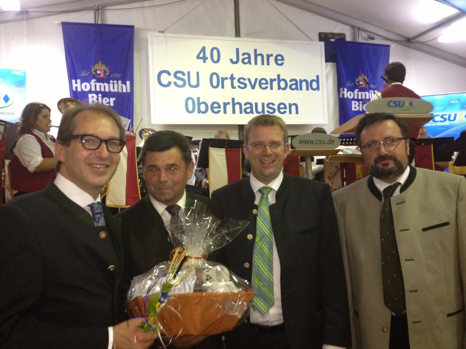 CSU-Generalsekretär Alexander Dobrindt sprach am Freitagabend im Unterhausener Festzelt anlässlich des 40jährigen Jubiläums des CSU-Ortsverbandes Oberhausen. In seiner Festrede lobte Dobrindt die wertvolle Arbeit des CSU-Ortsverbandes und dankte den Verantwortlichen für den jahrelangen Einsatz für die CSU. Ortsvorsitzender Georg Appel konnte auch MdB Dr. Reinhard Brandl begüßen, der in seiner Rede Bayern als das gelobte Land und Oberhausen als Mustergemeinde, in der dank moderner Technologie die Zukunft schon lange zu Hause ist, bezeichnete. Zum Abschluss der Veranstaltung wurden noch verdiente Mitglieder geehrt, darunter auch Gründungsmitglieder des Ortsverbandes Oberhausen.