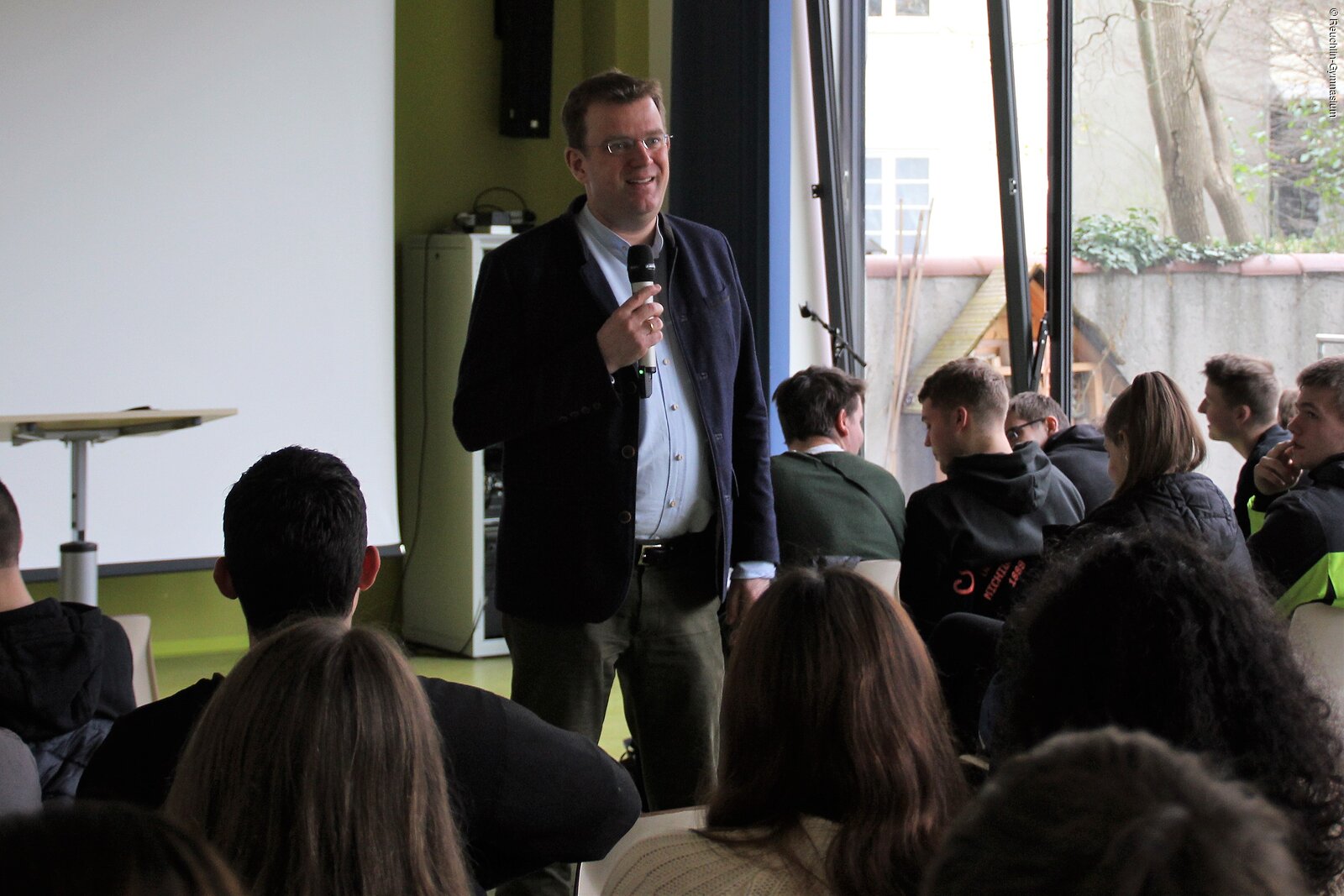 Der Bundestagsabgeordnete Reinhard Brandl gab in seinem Vortrag für die 12. Klassen des Ingolstädter Reuchlin-Gymnasiums Einblicke die aktuelle Bedrohungslage.