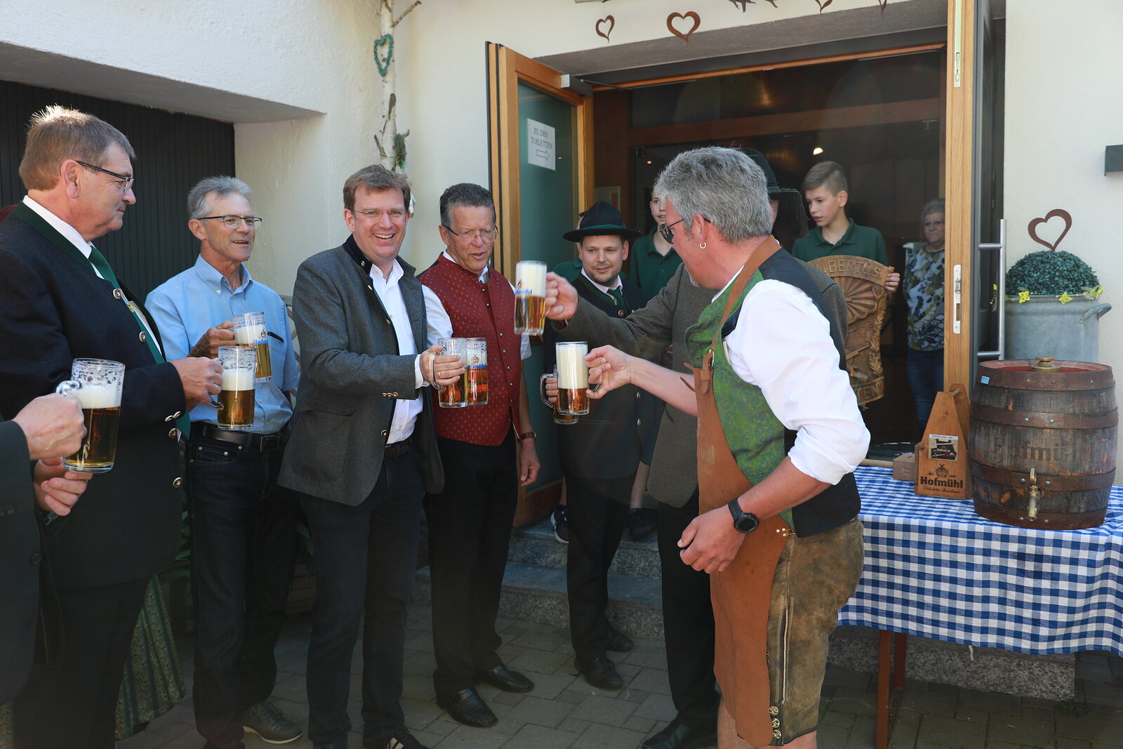 Nach einer Andacht mit Bänderweihe am Kriegerdenkmal zog der Tross, bestehend aus Ehrengästen und Fahnenabordnungen aller Ortsvereine, weiter ins Gasthaus Buchberger. Dort stach Schirmherr und Bürgermeister Roland Sammüller das erste Fass an.