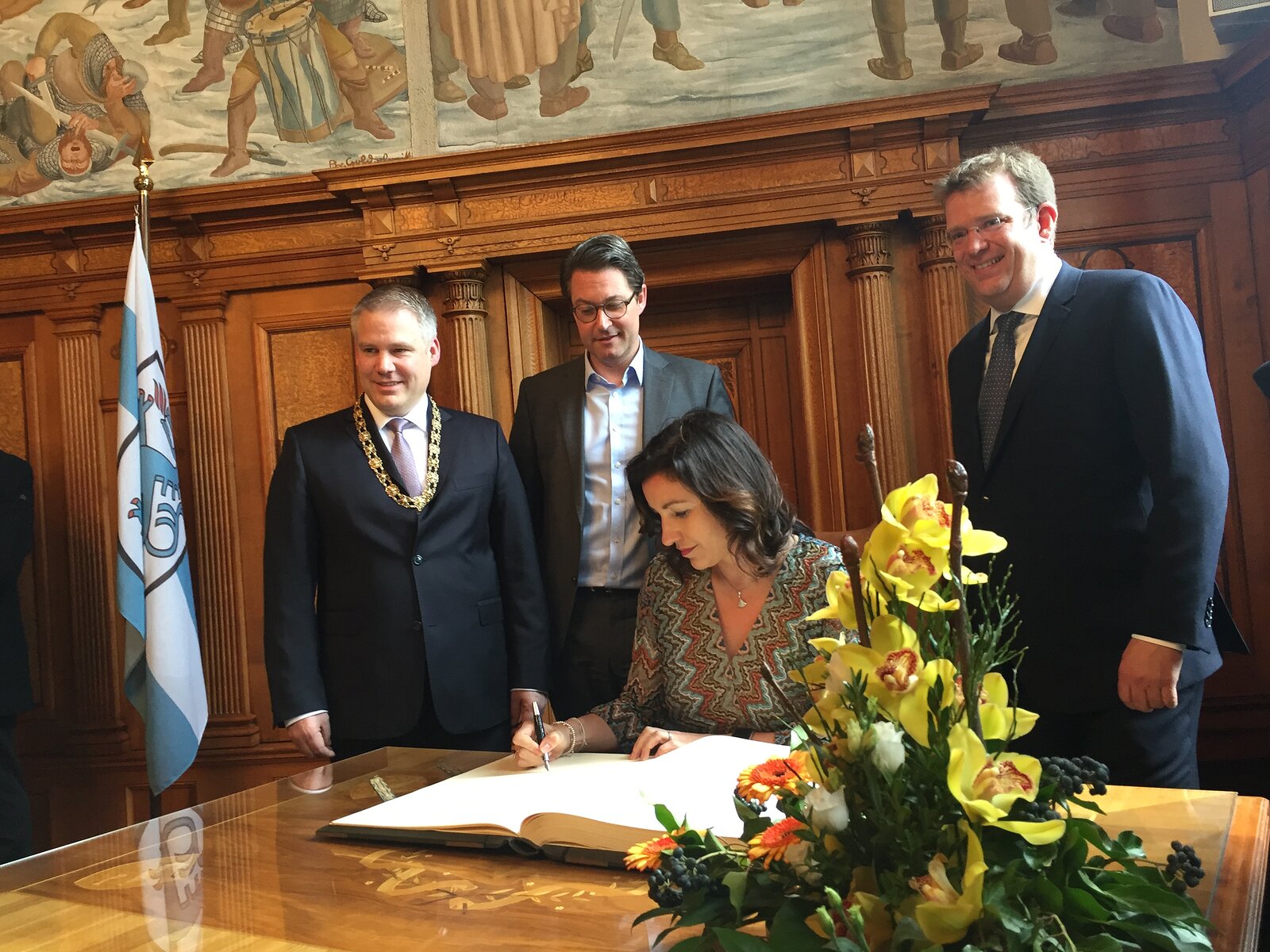 Staatsministerin Dorothee Bär und Bundesminister Andreas Scheuer war zur Enthüllung des City-Airbus nach Ingolstadt gekommen. Im Vorfeld der öffentlichen Veranstaltung auf dem Rathausplatz trugen sich die beiden Minister ins Goldene Buch der Stadt Ingolstadt ein. Oberbürgermeister Dr. Christian Lösel und MdB Dr. Reinhard Brandl begrüßten die Gäste herzlich im Historischen Sitzungssaal.