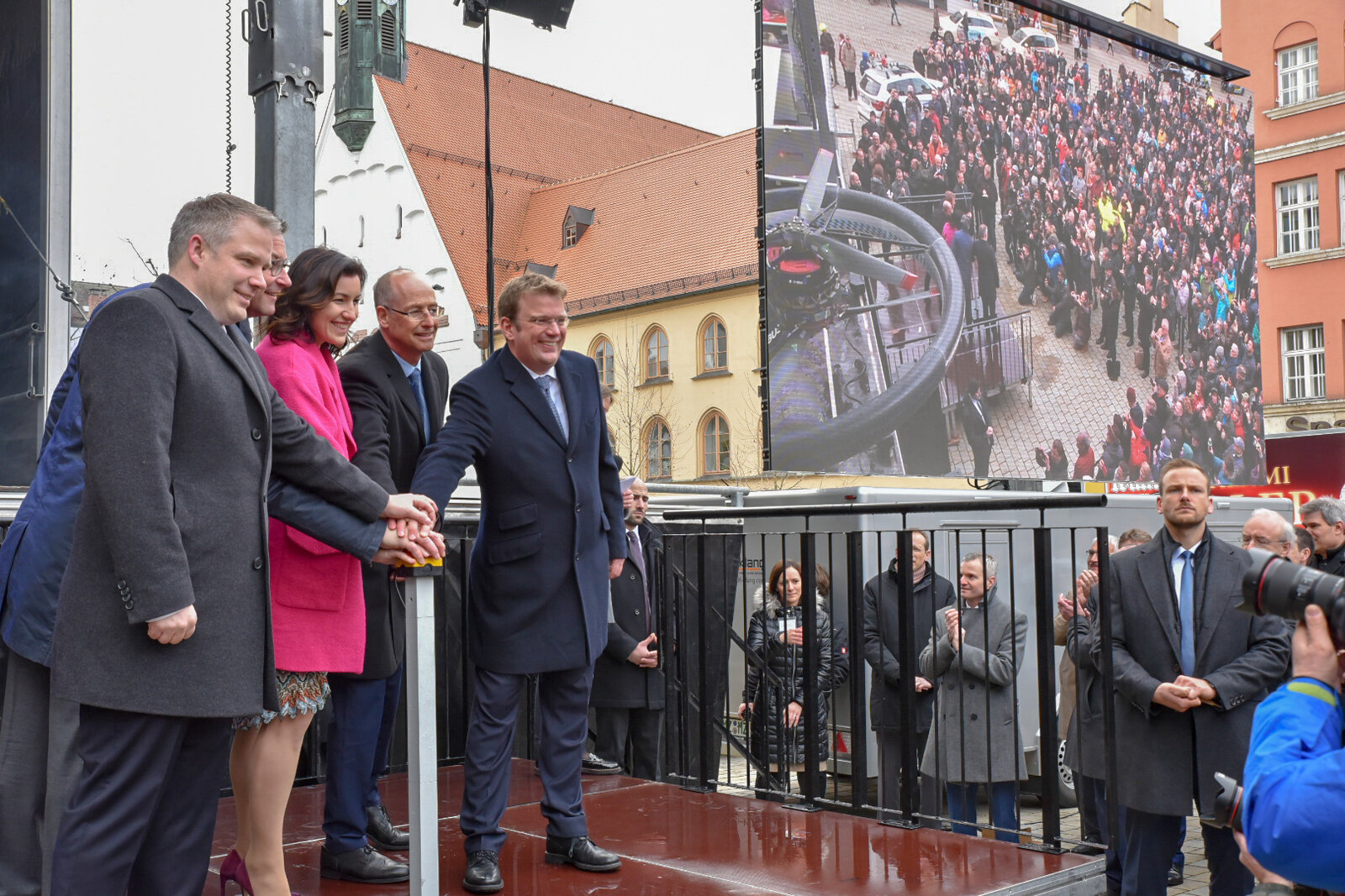 Zusammen mit seinen Berliner Kollegen Andreas Scheuer (Bundesminister für Verkehr) und Dorothee Bär (Staatsministerin im Kanzleramt) sowie Ingolstadts Oberbürgermeister Dr. Christian Lösel und Airbus-Helicopters-Chef Schoder durfte Dr. Reinhard Brandl den City-Airbus enthüllen.