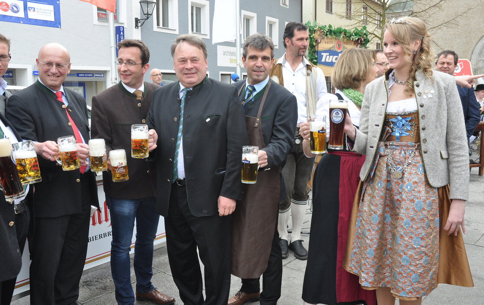 Zur Eröffnung der Bayerischen Bierwoche, die in diesem Jahr in Beilngries stattfand, war der Bayerische Staatsminister für Ernährung, Landwirtschaft und Forsten, Helmut Brunner, gekommen und trug sich zunächst ins Goldene Buch der Stadt ein. Bürgermeister Alexander Anetsberger begleitete den Ehrengast dann zum Kirchplatz, wo bereits Landrat Anton Knapp, der Vorsitzende des Hotel- und Gaststättenverbandes Siegfried Gallus und MdB Dr. Reinhard Brandl den Gast erwarteten. In seinem Grußwort lobte der Minister die Qualität des bayerichen Bieres, das ein echter Exportschlager ist und in vielen Ländern erfolgreich verkauft wird. Bierkönigin Marlene Speck war ebenfalls in Beilngries und zeigte wieder einmal, dass sie eine charmante Botschafterin für das "bayerische Grundnahrungsmittel" ist.