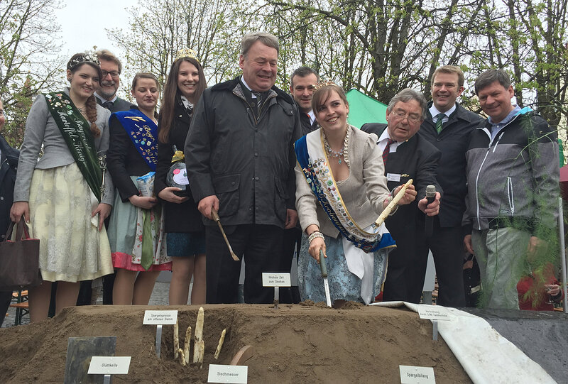 Die traditionelle Eröffnung der Spargelsaison auf dem Münchner Viktualienmarkt fand heuer im Regen statt. Nichts desto trotz hat es sich Staatsminister Helmut Brunner nicht nehmen lassen, im Beisein der Schrobenhausener Spargelkönigin Maria Reichhold, dem Vorsitzenden des Spargelerzeugerverbandes Südbayern, Josef Plöckl, Bürgermeister Dr. Karlheinz Stephan, Landrat Martin Wolf und MdB Dr. Reinhard Brandl, den Spargel aus dem eigens aufgebauten Bifang zu stechen. Die Spargelerzeuger hoffen auf gutes Wetter, damit wieder ein erstklassiger Spargel gestochen werden kann. Die Spargelsaison endet am 24. Juni, dem Johannitag.