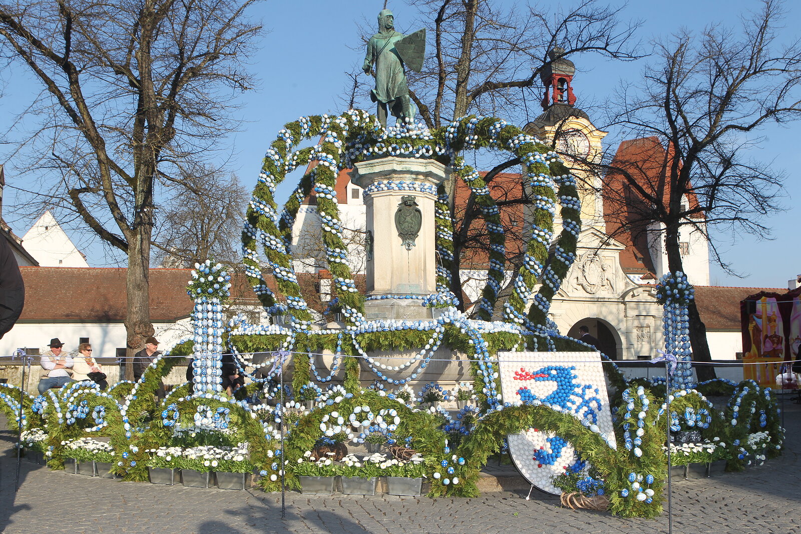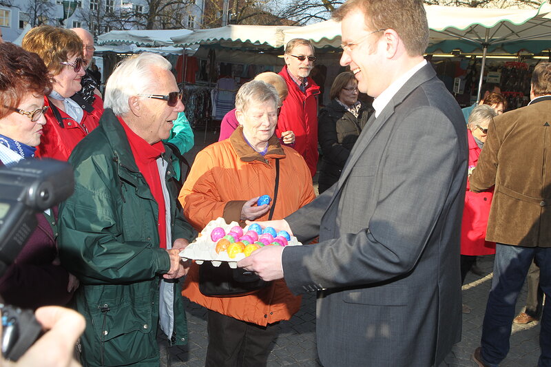 Mit über Zehntausend weiß und blau bemalten Eiern ist der Osterbrunnen am Ingolstädter Paradeplatz der größte weiß-blaue Brunnen in Bayern. Die Initiatorin, Stadträtin Brigitte Fuchs, bemalt das ganze Jahr über mit ihren fleißigen Helferinnen die Eier und schmücken dann zur Eröffnung des Ostermarktes den Brunnen. Nach der Eröffnung durch Bürgermeister Albert Wittmann wurden an die Gäste bunte Ostereier verteilt. Bei herrlichem Wetter war auch MdB Dr. Reinhard Brandl wieder mit dabei und freute sich mit den Besuchern über den außerordentlich schönen und gelungenen Blickfang am Paradeplatz.