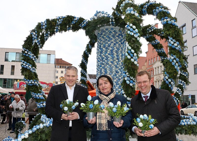 Der Ingolstädter Ostermarkt wurde in diesem Jahr auf dem Rathausplatz aufgebaut, da der Paradeplatz wegen der Sanierung der Fußgängerzone zur Zeit dafür nicht geeignet ist. Der Osterbrunnen wurde zum 18. Mal unter der Leitung von Stadträtin Brigitte Fuchs mit ihren Helferinnen mit über Fünftausend weiß-blau bemalten Eiern geschmückt. Oberbürgermeister Dr. Christian Lösel eröffnete den Ostermarkt und wünschte allen Gästen "Frohe Ostern"! Gerne war auch in diesem Jahr wieder Dr. Reinhard Brandl zur Eröffnung gekommen und bedankte sich bei Brigitte Fuchs und ihren Helferinnen für den wieder sehr gelungenen und schönen Osterbrunnen am Rathausplatz.