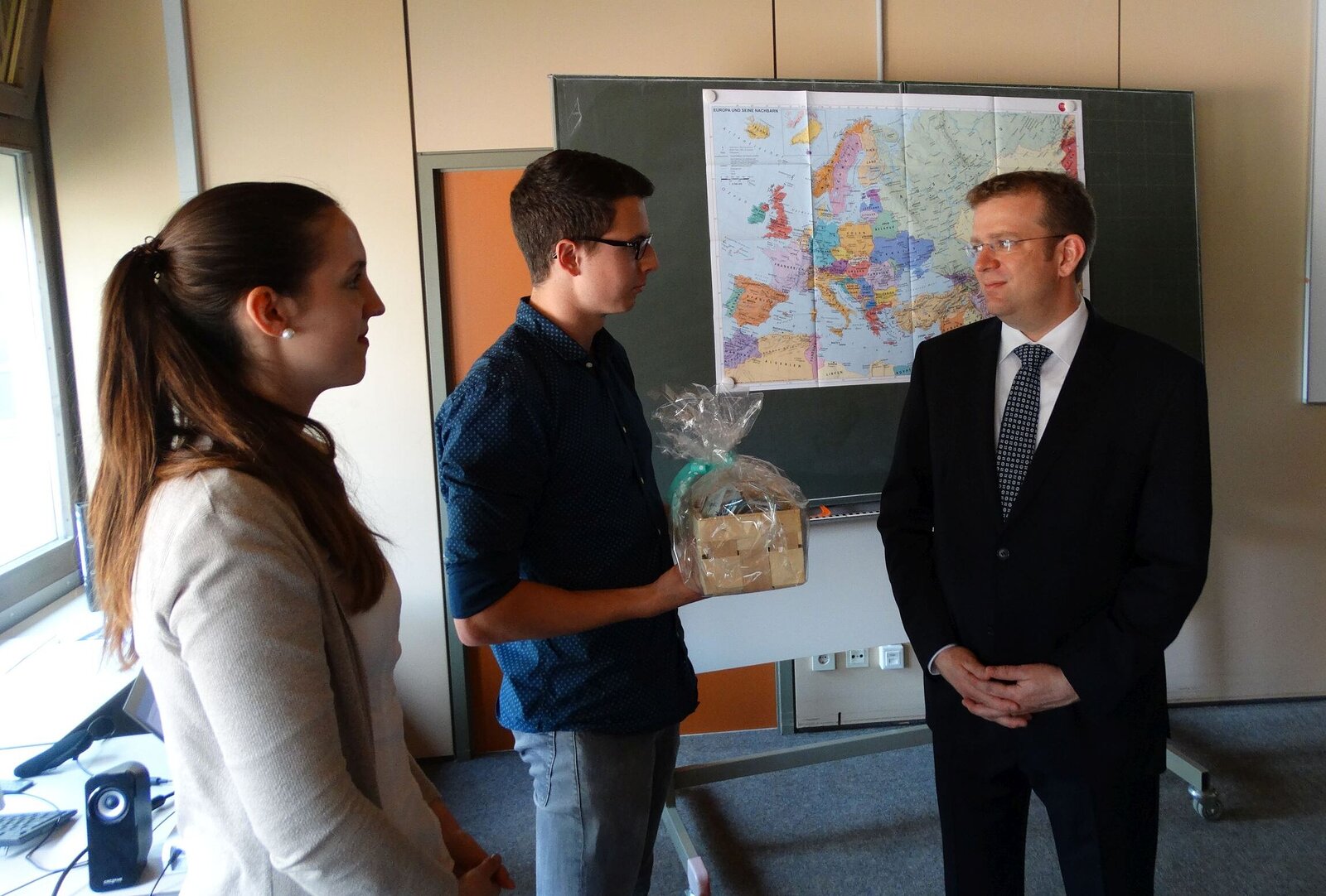 Anlässlich des bundesweiten Europatages besuchte MdB Dr. Reinhard Brandl die Berufsschule Neuburg. Bereits im Vorfeld hatten sich einige Schulklassen auf diesen Tag gut vorbereitet. In seinem Vortrag schilderte der Abgeordnete aktuelle Entwicklungen in der Sicherheitspolitik und die daraus resultierenden Maßnahmen seitens der Politik. Besonders betroffen machten die Schülerinnen und Schüler die Flüchtlingsfrage und deren Probleme für ganz Europa. Am Ende seiner Präsentation war Dr. Brandl offen für Fragen. Die Schülerinnen und Schüler beteiligten sich intensiv an der Diskussionsrunde und bedankten sich abschließend beim Abgeordneten für sein Kommen.