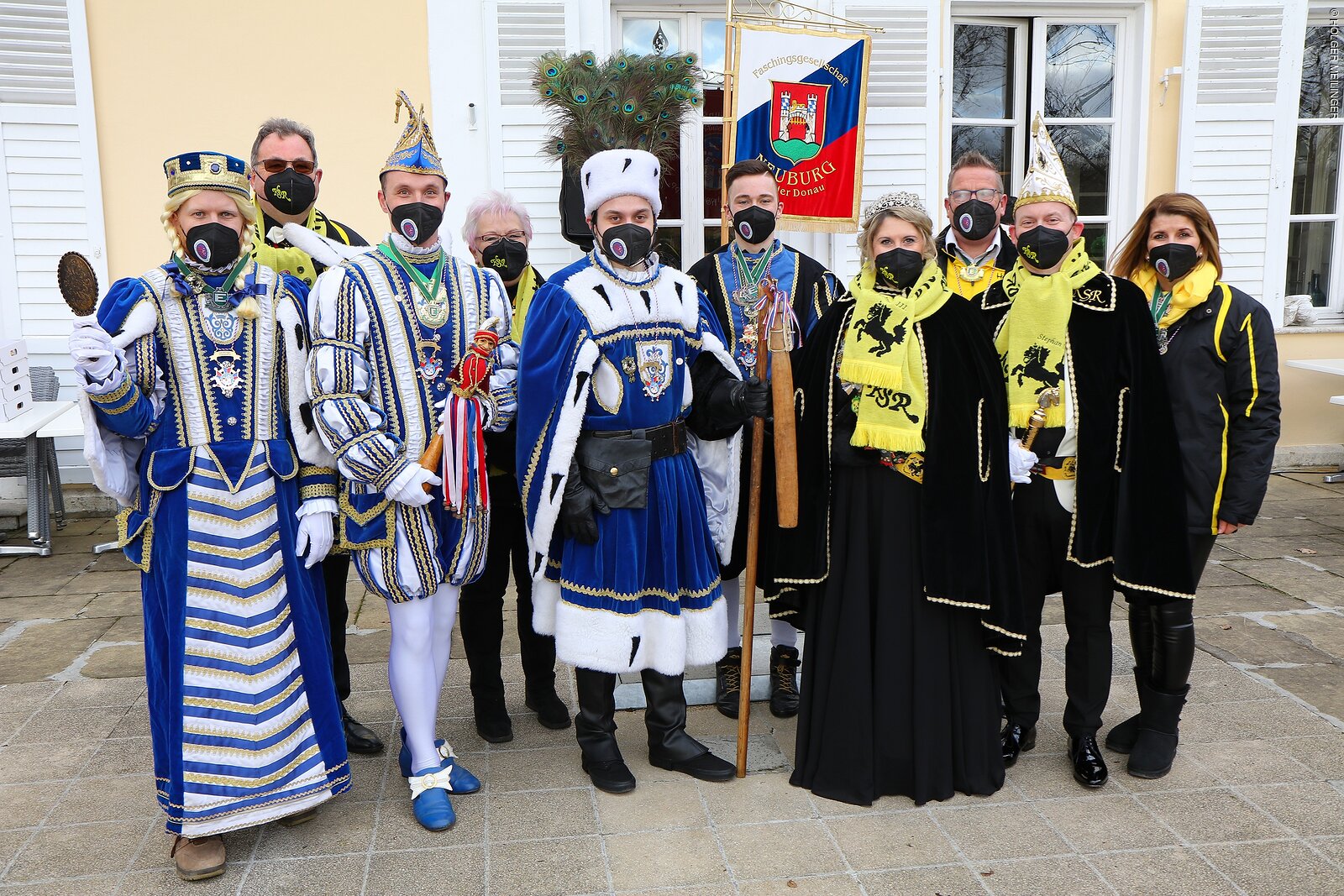 Die Veranstaltung fand „Corona-konform“ draußen auf der Terrasse des Arco Schlösschens statt. Die einzelnen Orden wurden vom Neuburger Dreigestirn, bestehend aus „Jungfrau“ Fabian Langner, „Prinz“ Alexander Mayer und „Bauer“ Niklas Karmann, übergeben.