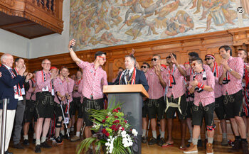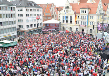 Mit einem grandiosen Fest feierte Ingolstadt den Aufsteig des FC 04 in die erste Bundesliga. Zehn Tausend Menschen versammelten sich auf dem Rathausplatz und den umliegenden Straßen und Plätzen, um den Aufstieg des FC 04 zu feiern und der Mannschaft zu gratulieren. Oberbürgermeister Dr. Christian Lösel empfing die Spieler im Historischen Sitzungssaal des Rathauses. Nach der Gratulation trugen sich die Spieler ins Goldene Buch der Stadt Ingolstadt ein. Viele Ehrengäste, darunter auch MdB Dr. Reinhard Brandl, waren mit dabei und freuten sich mit der Mannschaft, dem Trainer und den Betreuern. Anschließend zeigten sich die Akteure auf der eigens aufgebauten Bühne vor dem Rathaus und genossen die Ovationen der begeisterten Fans. "Dieser Tag wird in den Geschichtsbüchern der Stadt Ingolstadt seinen Platz finden", so Oberbürgermeister Dr. Lösel.