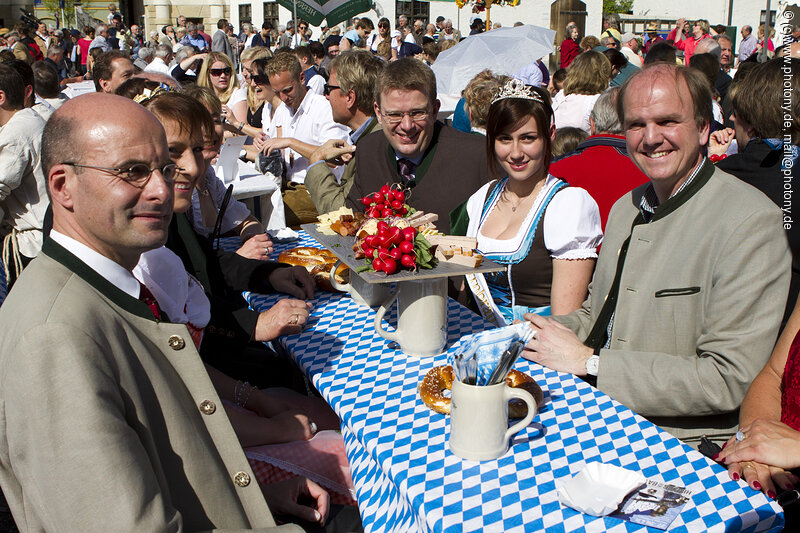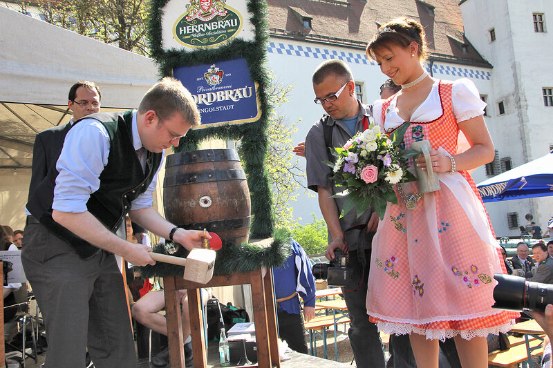 Bei herrlichem Wetter zapfte der Schirmherr des Georgifestes, MdB Dr. Reinhard Brandl, im Schlossinnehof das erste Faß an. In seinem launigen Grußwort erinnerte er an die Legende des heiligen Georg, der auch Schutzpatron der Landwirte und hier für gutes Wetter zuständig ist. Gutes Wetter sei notwendig für guten Hopfen, der wiederum Voraussetzung für gutes Bier ist. Diese Aufgabe habe der hl. Georg in vollem Umfange erfüllt, so der Abgeordnete. Im Jahre 1516 wurde das Bayerische Reinheitsgebot in Ingolstadt verkündet. Reinhard Brandl freute sich mit den zahlreichen Gästen über die schöne Tradition, die hier in Ingolstadt gepflegt wird.