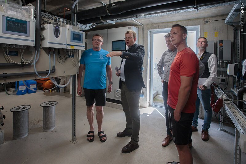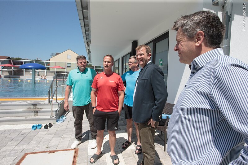 Brandl zeigte sich bei seinem Besuch angetan. „Ich bin wirklich begeistert – sowohl vom Bau als auch von der Technik“. Gemeinsam mit Bürgermeister Helmut Schloderer und Stadtbaumeister Thomas Seitz ließ er sich von den beiden Fachangestellten für Bädertechnik Franz und Wolfgang Braun die Freizeiteinrichtung detailliert zeigen. Dabei warfen sie auch einen Blick in die „Motor-Räume“, in der die Technik untergebraucht ist.  Brandl versprach nach seinem Rundgang wiederzukommen, dann mit Badehose.