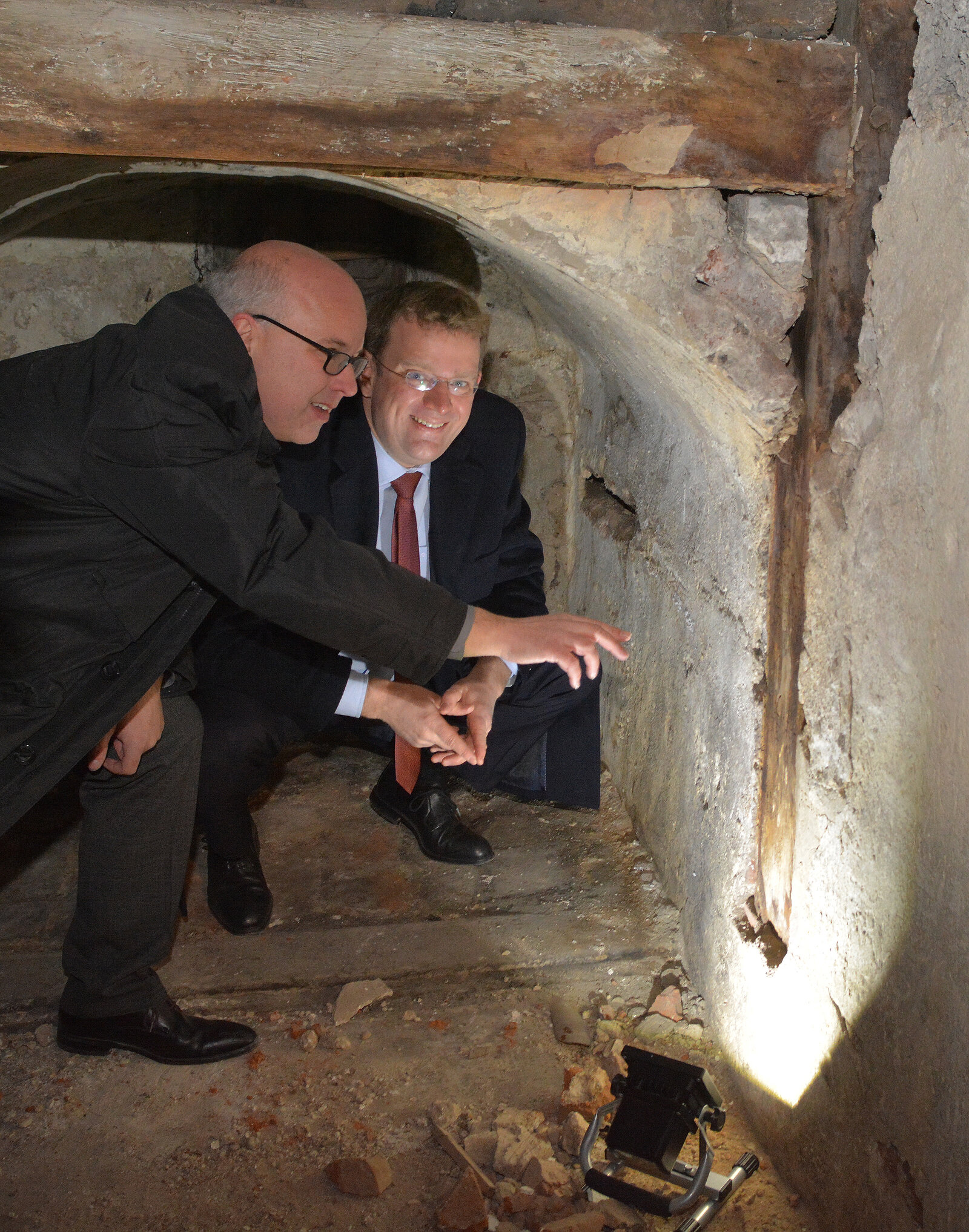 Um sich vor Ort über die Sanierung des Georgianums, den Fortgang der vorbereitenden Untersuchungen und das Konzept der künftigen Nutzung zu informieren, besuchte MdB Dr. Reinhard Brandl das Baudenkmal. Der Geschäftsführer der INKoBauGmbH, Herr Nicolai Fall, zeigte dem Abgeordneten den entdeckten Karzer.