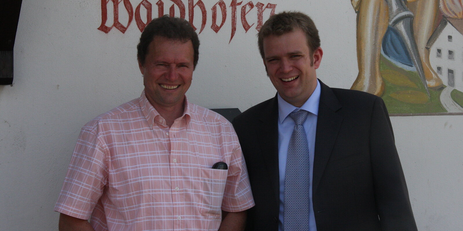 Eine Gemeinderundfahrt leitete den Besuch des Bundestagskandidaten Reinhard Brandl bei Bürgermeister Josef Lechner in Waidhofen ein. Lechner hatte einige Erfolge, wie die nun fertiggestellte B300, oder auch den vorbildlich neu angelegten Friedhof vorzuzeigen. Allerdings macht der Gemeinde die Einengung durch die FFH (Fauna-Flora-Habitat)-Bereiche zu schaffen, die generell nicht bebaut werden dürfen. Daher sind Zufahrtregelungen zur B300 nur schwer zu realisieren und neue Baugebiete nur begrenzt ausweisbar. Für die Zukunft stehen der Gemeinde große Investitionen für die Ortsteilentwässerung, sowie die Errichtung eines Gemeindezentrums bevor. Brandl lobte Lengler für das äußere Erscheinungsbild seiner Gemeinde – „sichtbar lebens- und liebenswert“, so Brandl.